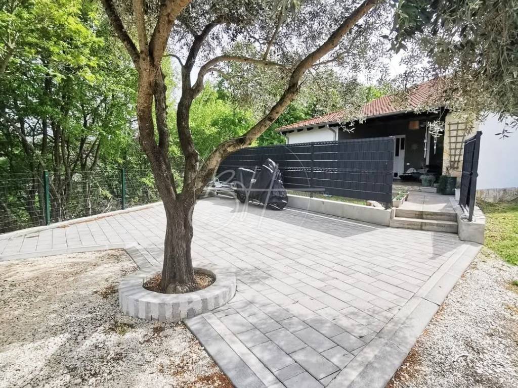 Na okućnici se nalazi djelomično natkrivena terasa od 15 m², prednji i stražnji vrt te privatni parking za do tri automobila. Kuća je klimatizirana, s mogućnošću postavljanja kamina, i orijentirana prema jugozapadu, što osigurava prirodno svjetlo tijekom cijelog dana.