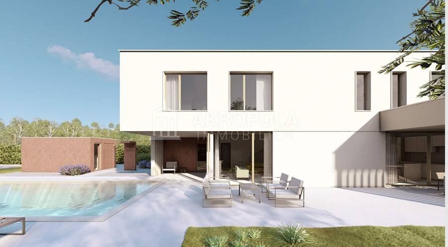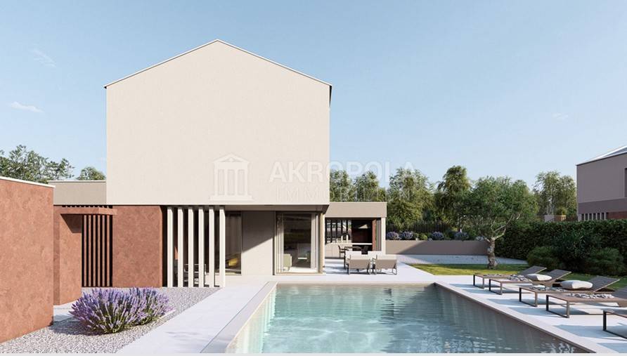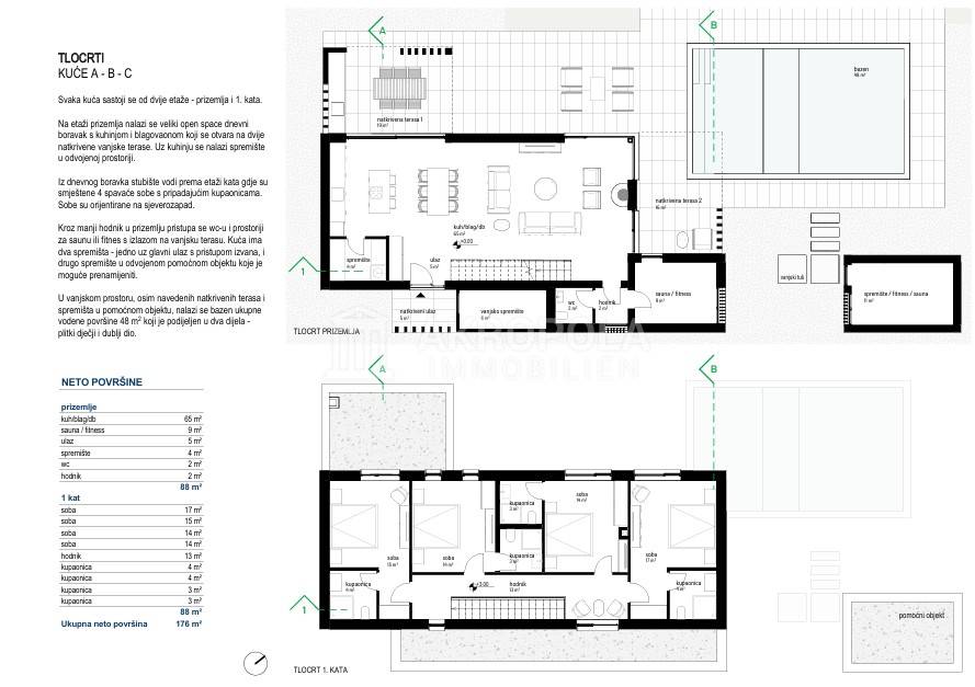 Na ovoj etaži također nalazimo i spremište (unutarnje i vanjsko), prostoriju za saunu/fitness te prijelaz na natkrivenu terasu sa ljetnom kuhinjom te grijanim bazenom u produžetku sa masažnim dijelom ukupne površine 48 m2.