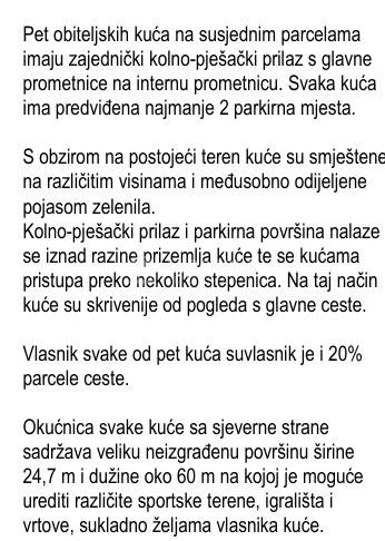Blizina svih potrebnih sadržaja kao što su trgovina, škola, pošta, dom zdravlja, sportski sadržaji, restorani, čine ovu lokaciju odličnim izborom ukoliko se želite baviti turističkim iznajmljivanjem te tako brže vratiti uložena sredstva.