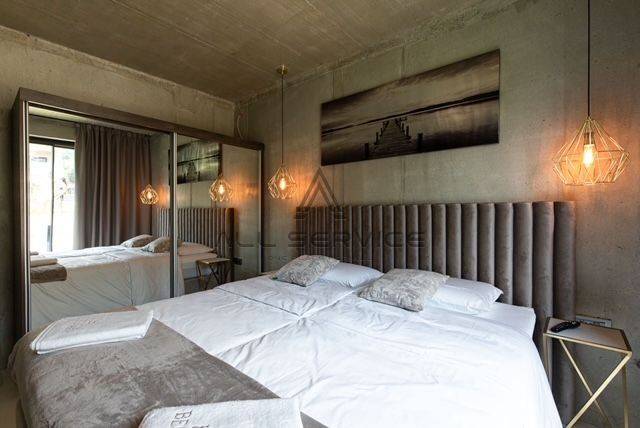 Spavaće sobe i cijela etaža uređene su u suvremenom industrijskom stilu.