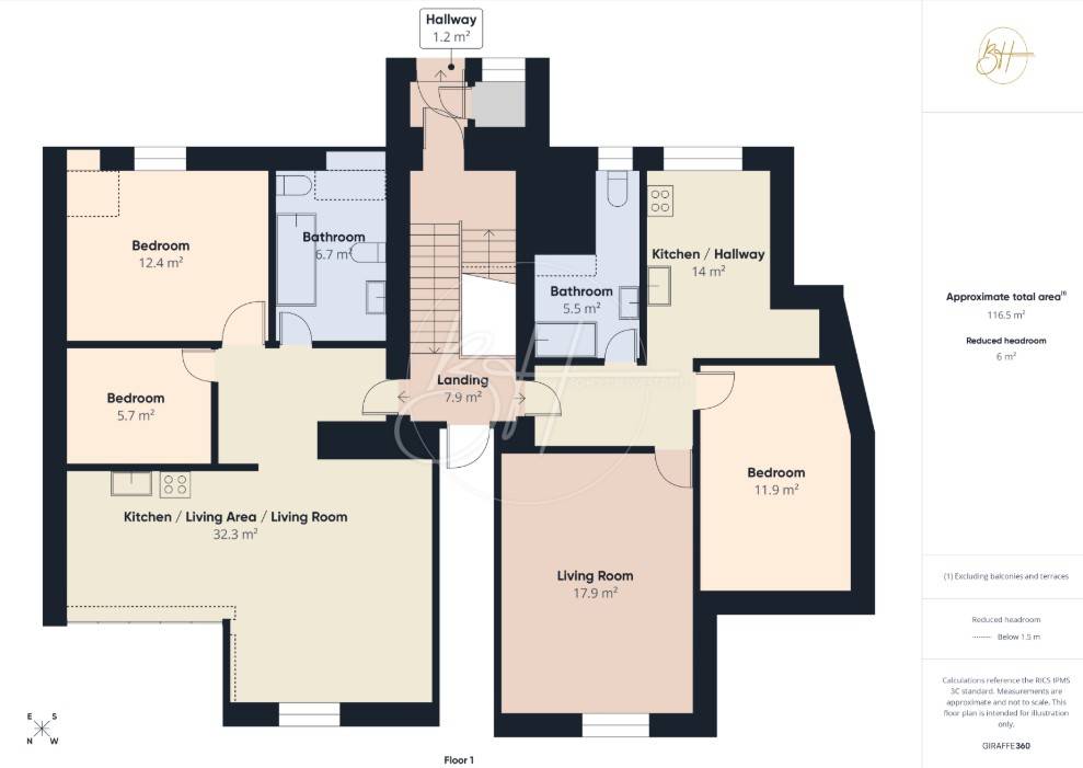 Stan 1 – 50 m² - open space kuhinja s blagovaonicom i dnevnim boravkom, dvije spavaće sobe, kupaonica