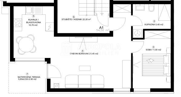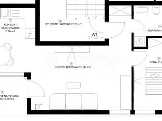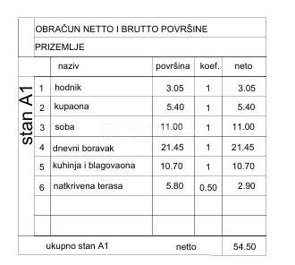 Stan u prizemlju sa vrtom, neto površina stana 54,50 m2, vrt 125 m2, parkirno mjesto, ukupna neto površina 73,20 m2.