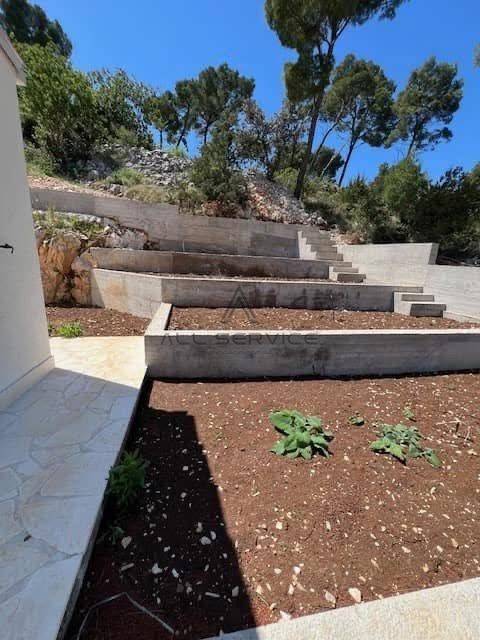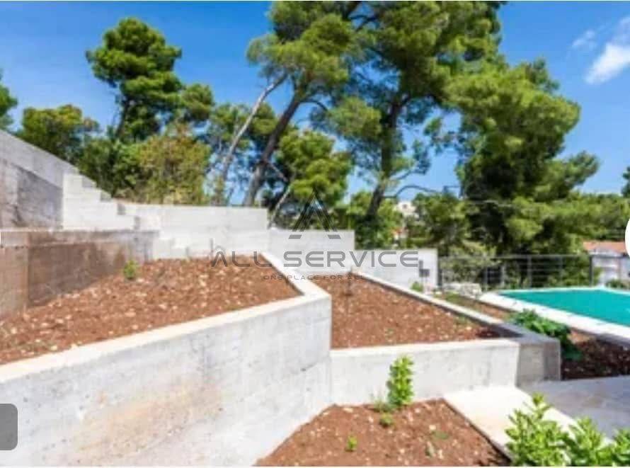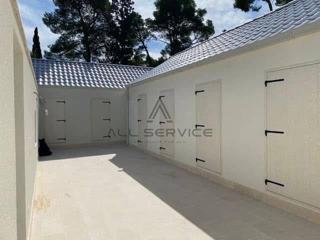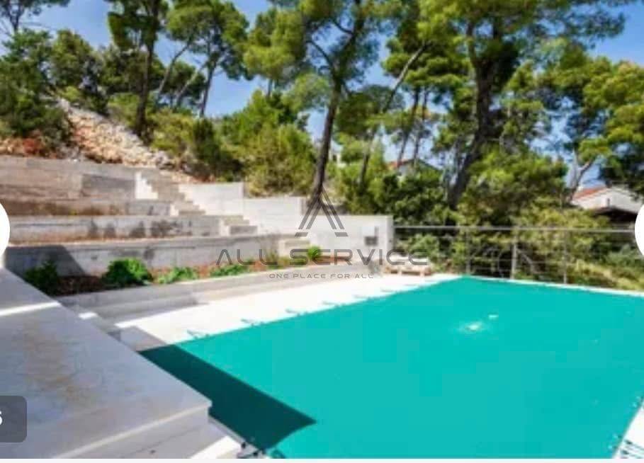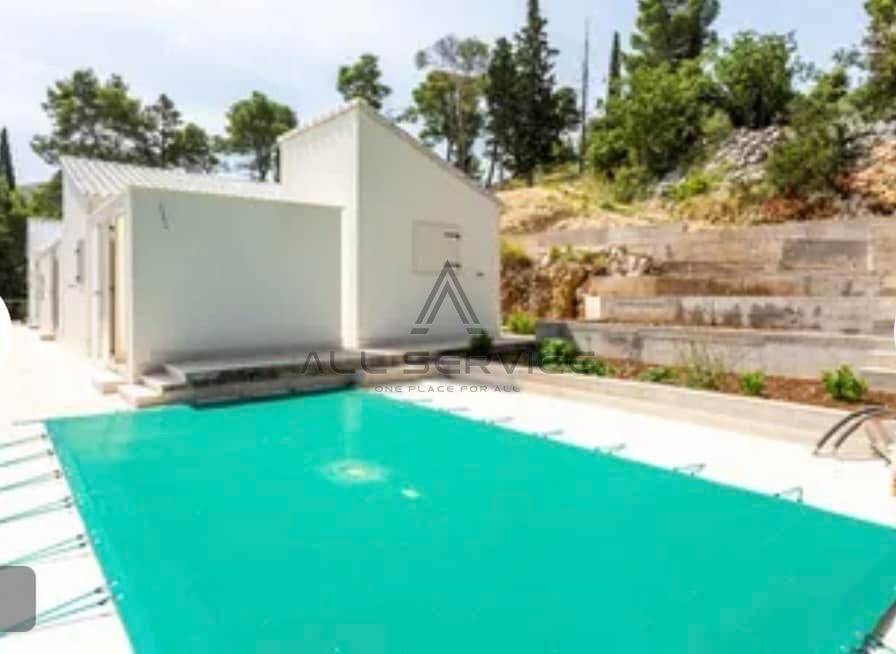 dvorišta popločana bračkim kamenom i staze popločane mozaikom, vanjski bazen dimenzija 3×6 m, kupaonice opremljene sa svim sanitarnim čvorovima.
