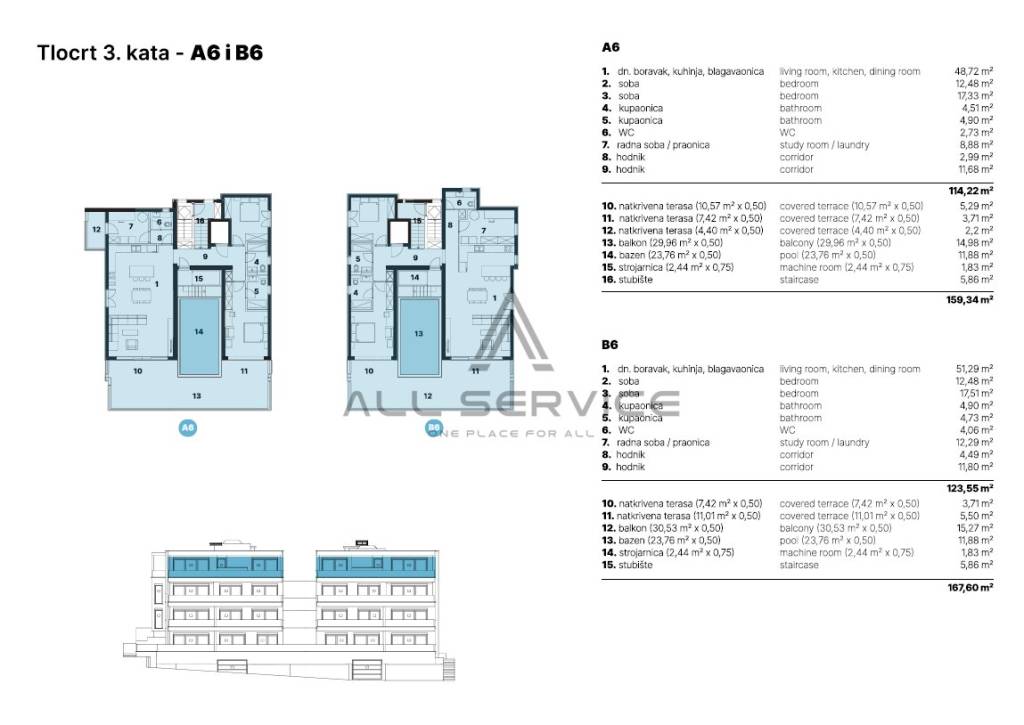 Located at the top of the building, this exclusive three-room apartment (A6) offers a spacious living room, two elegantly designed bedrooms, two bathrooms, and a large covered terrace with a private pool and panoramic sea views.