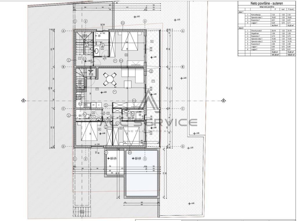 Razizemlje, prizemlje i kat se sastoje od ukupno 4 stambene jedinice i 5 vanjskih parkirnih mjesta od kojih svaki stan ima vlastiti odvojeni ulaz.