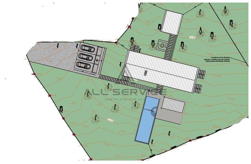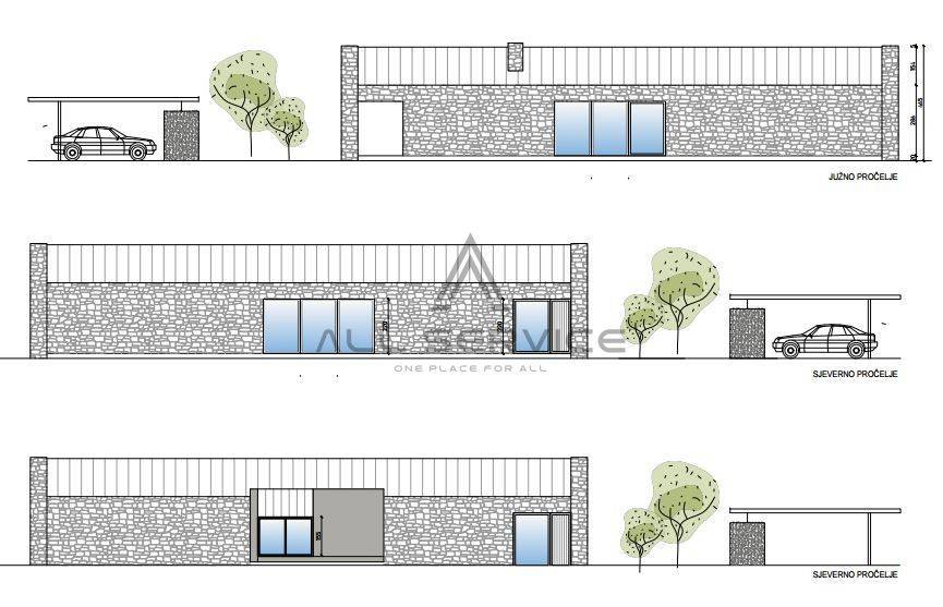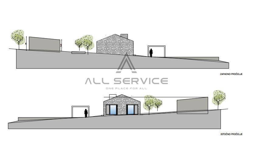 A building plot of 1,870 m² is for sale, located in the peaceful village of Tinj, near Biograd na Moru. The land comes with a project and a building permit for the construction of a modern Mediterranean-style single-story house, measuring 8 m x 22.5 m, with a total living area of 140 m².