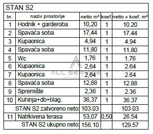 Raspored prostorija: Ulazni hodnik s ugradbenim ormarom 3 spavaće sobe, svaka s privatnom kupaonicom 3 kupaonice te dodatni gostinjski toalet Spremište Prostrani open-space dnevni boravak s kuhinjom i blagovaonicom Velika natkrivena terasa s izravnim pristupom iz svih prostorija