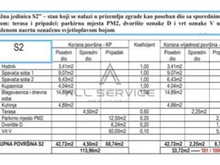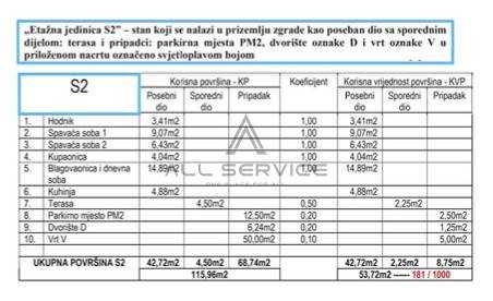 Stan se sastoji od ulaznog hodnika, prostranog dnevnog boravka i blagovaone s izlazom na terasu, dvije spavaće sobe,vanjskog parkirnog mjesta i vrta.