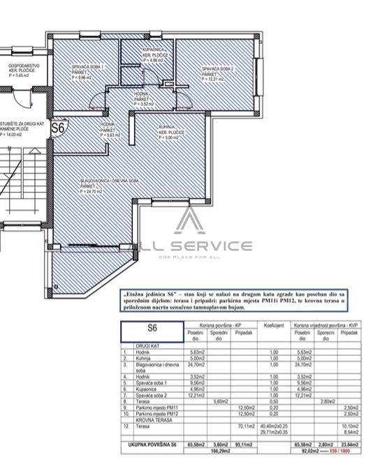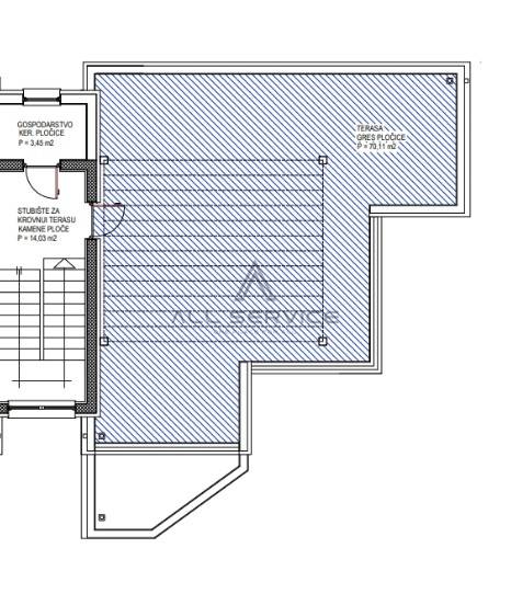 Stan se sastoji od ulaznog hodnika, prostranog dnevnog boravka i blagovaone (cca 30m2) s izlazom na terasu, tri spavaće sobe, kupaonice i 2 vanjska parkirna mjesta. Uz stan dolazi i predivna krovna terasa od preko 70m2.