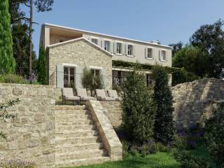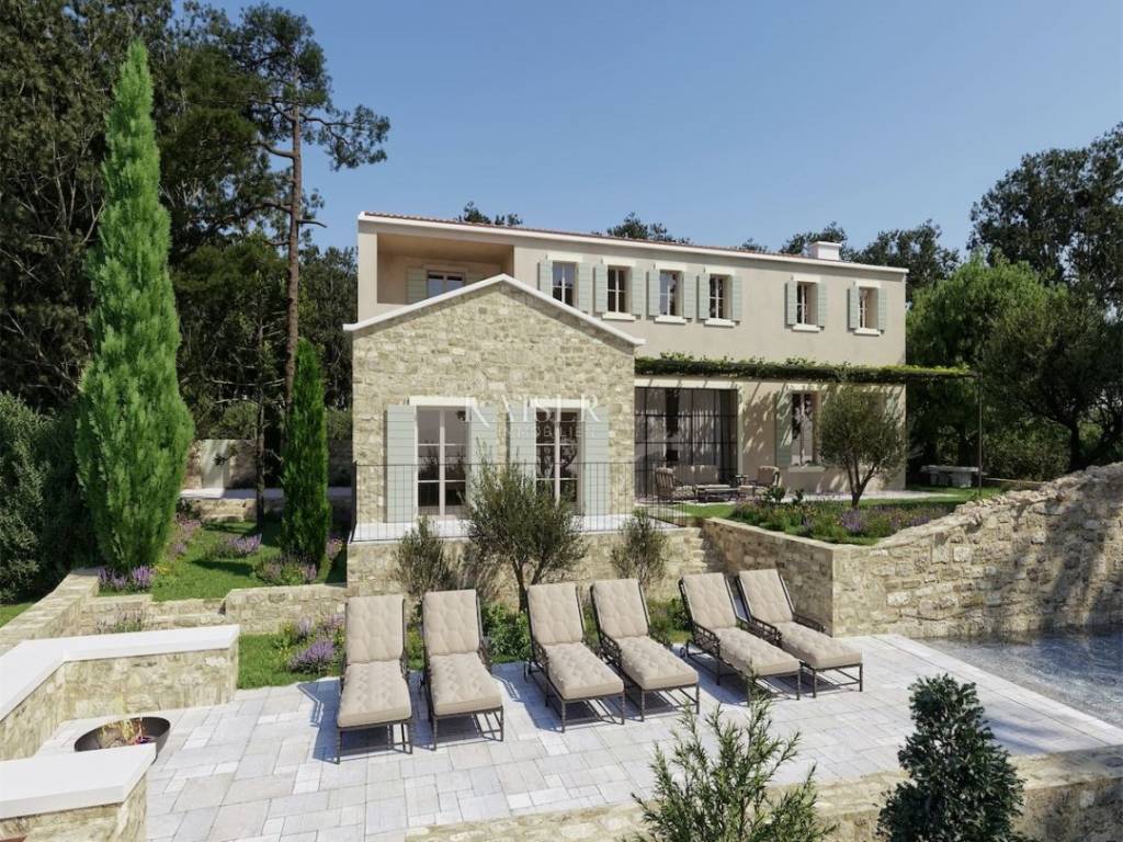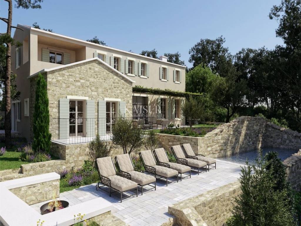 Ova prostrana, ali vrlo intimna vila pravi je spoj moderne arhitekture i temelja stare kamene kuće. Ugradnjom kamenih ruševina u funkcionalne dijelove ove moderne vile postala je potpuno uronjena u mikrolokaciju i – doslovno – jedinstvena. Lokacija nekretnine je idilična, a veličina cijele parcele jednaka je 1010 četvornih metara. Vila je okružena zelenilom, a na imanju se nalaze 100 godina stara stabla hrasta i duda, kao i ostala mediteranska vegetacija poput maslina, nara, smokve i drugih. Što se tiče pogleda s vile, možete odabrati svoje omiljeno – more, vinograde ili maslinike koji okružuju parcelu.