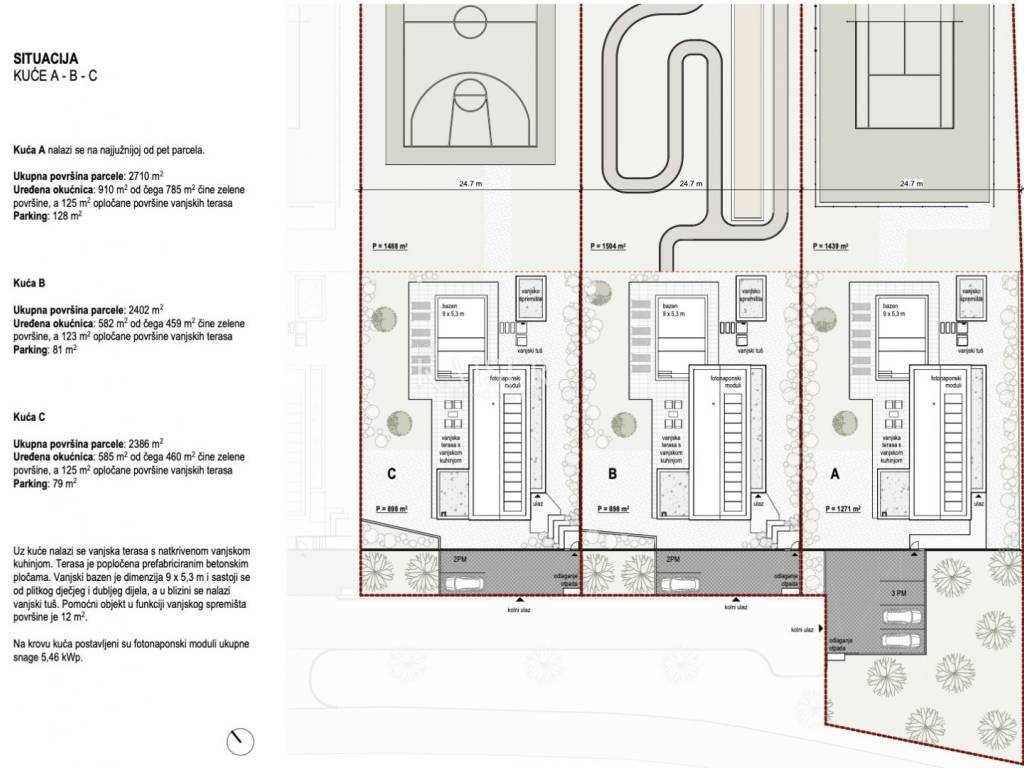 Parking je ukupne kvadrature 81 m2. Stambena površina iznosi 176 m2.