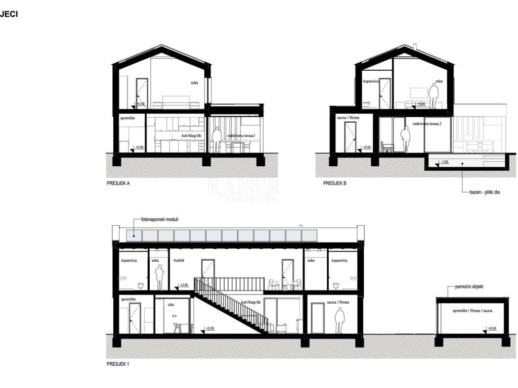 Na ovoj etaži također se nalazi i spremište (unutarnje i vanjsko), prostorija za saunu/fitness te prijelaz na natkrivenu terasu sa ljetnom kuhinjom te grijanim bazenom u produžetku sa masažnim dijelom ukupne površine 48 m2.