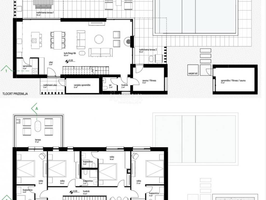 Na ovoj etaži također se nalazi i spremište (unutarnje i vanjsko), prostorija za saunu/fitness te prijelaz na natkrivenu terasu sa ljetnom kuhinjom te grijanim bazenom u produžetku sa masažnim dijelom ukupne površine 48 m2.