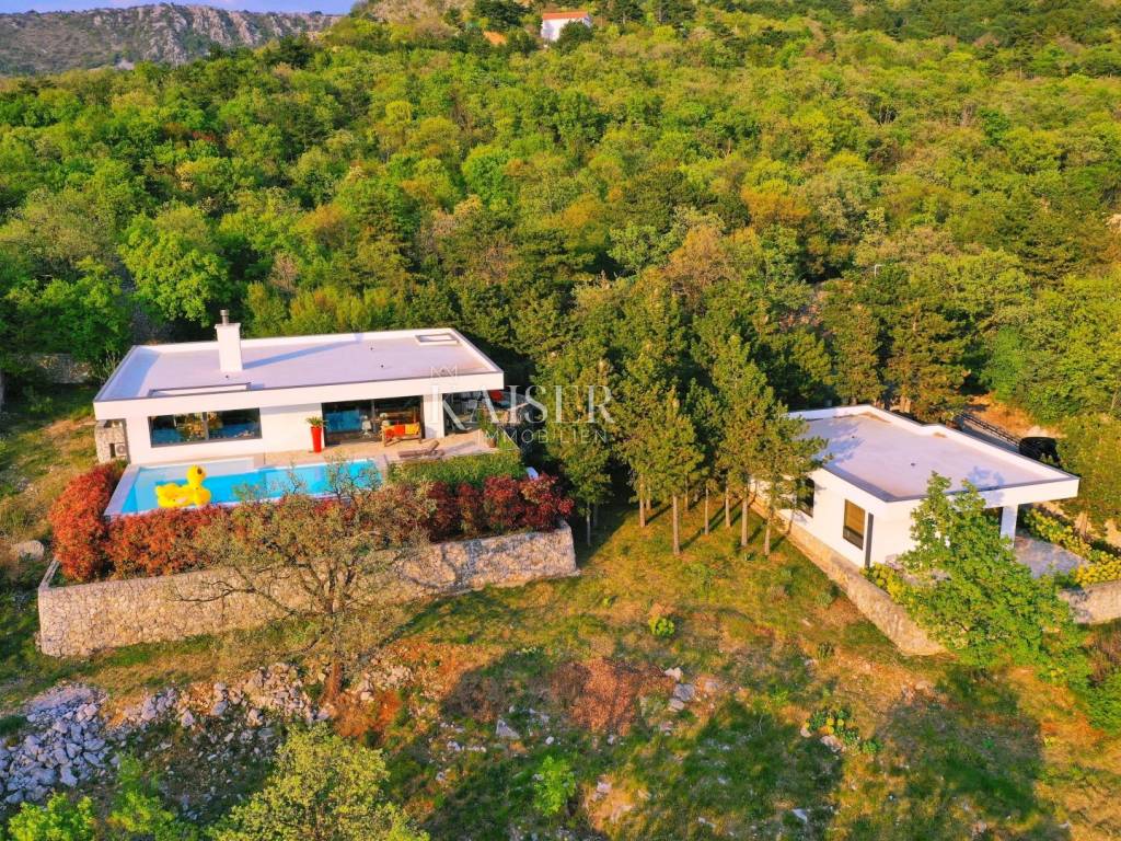 U našoj ponudi, na predivnoj i uređenoj okućnici površine 1333 m2, smještene su dvije moderne samostojeće prizemnice, koje su kod izgradnje vođene smjernicama udobnosti, komfora i luksuza pružajući kompletnu privatnost i intimu. Smještene su na izrazito mirnoj lokaciji u slijepoj ulici okruženoj zelenilom. Manji objekt sastoji se od garaže i apartmana površine 40 m2 iz kojeg se izlazi na terasu od 30 m2, te se koristi u svrhu turističkog najma. Glavni objekt je površine 120 m2, a sastoji se od kuhinje s blagovaonicom, dnevnog boravka s izlazom na terasu i bazen, jedne velike master spavaće sobe i jedne manje sobe te kupaone. Prilikom gradnje korištena visoka kvaliteta materijala i opreme. Okućnica je vrlo uredna, održavana, puna raznovrsnih mediteranskih bilja koja dodatno daju ljepotu te priliku za uživanje u ljetnim danima.