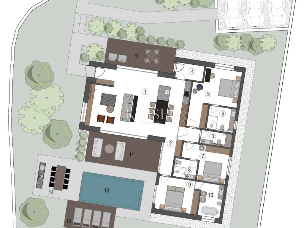 Vanjski dio vile stvoren je za vaš užitak. Doslovno – bilo da odaberete bazen, sunčalište, jednu od dvije terase s dnevnim boravkom ili mjesto u vanjskoj kuhinji, bit će to pravi užitak. S vanjske strane ove zone uživanja je šuma i zelenilo koje izdvaja ovu vilu u svoj mali raj.