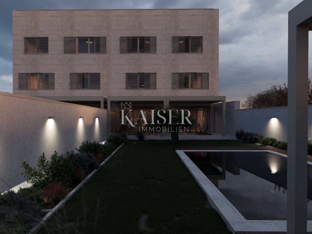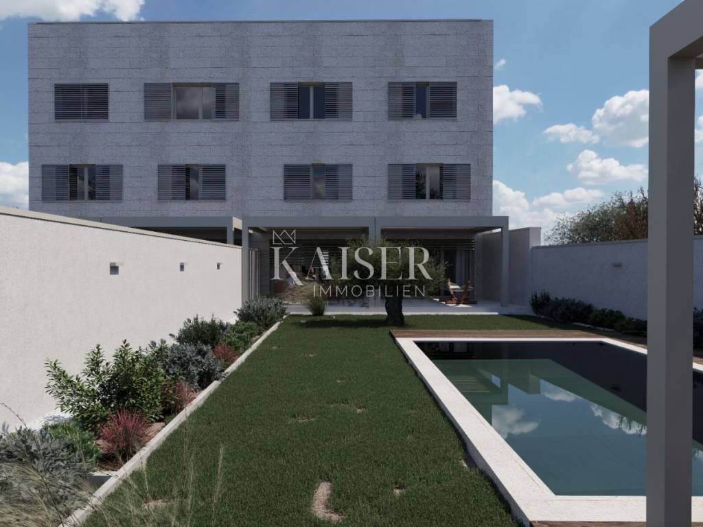 Bazen je zidan, obložen keramikom i opremljen pripremom za grijanje, a ono što ga čini dodatno privlačnim je činjenica da nijedan stan nema terasu ili balkon usmjeren direktno prema bazenu, čime je osigurana dodatna privatnost — jedino su prozori orijentirani prema toj zoni. Dvoetažna konfiguracija stana omogućuje i dodatnu fleksibilnost: postoji mogućnost organizacije odvojenog ulaza za gornju etažu, što otvara priliku za podjelu u dva stana – idealno za osobno korištenje jednog dijela i turistički najam drugog.