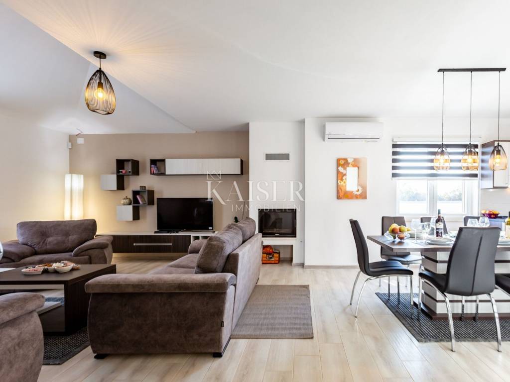 Kuća se prostire na dvije etaže – prizemlje i prvi kat. Ulaz u kuću vodi preko natkrivene terase površine 1,17 m², nakon čega slijedi hodnik veličine 11,50 m². S lijeve strane nalazi se prva kupaonica s WC-om, tušem i perilicom rublja (4,59 m²), dok se s desne strane, ispod stubišta, smjestila praktična ostava od 4,03 m². U prizemlju se nalazi i prva spavaća soba (10,88 m²), potpuno opremljena i namještena. Iz hodnika se ulazi u prostrani dnevni prostor otvorenog koncepta površine 44.69m2, koji uključuje moderno uređenu i potpuno opremljenu kuhinju, blagovaonicu i dnevni boravak. Kuhinja sadrži sve potrebne uređaje: pećnicu, indukcijsku ploču, mikrovalnu pećnicu, aparat za kavu, perilicu posuđa te hladnjak sa zamrzivačem. Dnevni boravak nudi udoban trosjed, dvosjed, fotelju, televizor sa satelitskim programima, kamin na drva i klima uređaj. Iz boravka se izlazi na natkrivenu terasu površine 6,30 m², idealnu za jutarnju kavu ili večernje opuštanje.