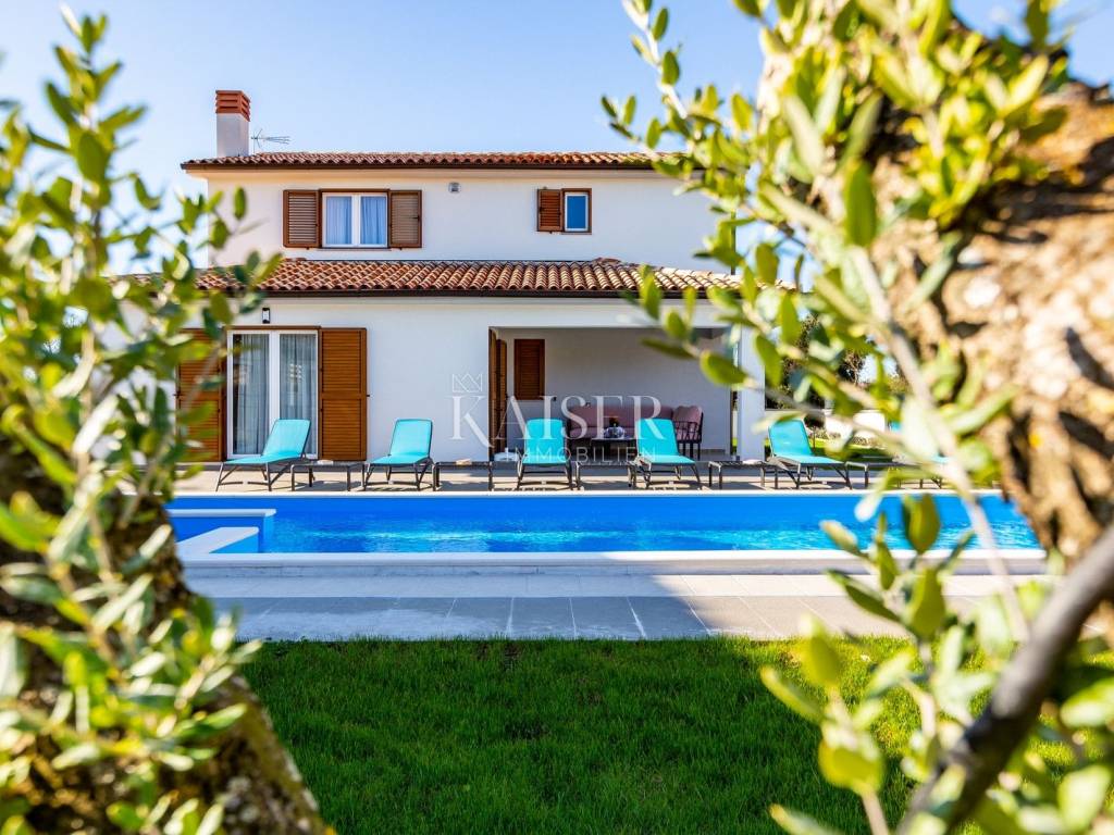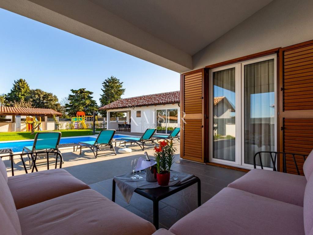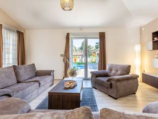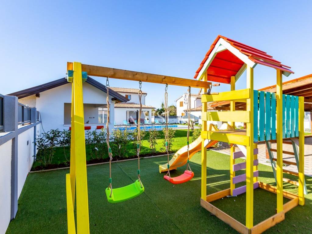 Poseban dragulj ove nekretnine je prostrana okućnica od 1.000 m², koja uključuje brojne sadržaje: bazen dimenzija 10 x 5 m, jacuzzi, sobu za opuštanje sa saunom, potpuno opremljenu vanjsku kuhinju s plinskim roštiljem, dječji kutak s toboganom i ljuljačkom, te pomoćnu zgradu od 40 m². Cijela parcela je ograđena, što jamči potpunu privatnost. Zelene površine se automatski navodnjavaju, a okućnicu krasi bogatstvo mediteranskog bilja poput lavande, ružmarina, smilja i mente, kao i voćke: naranče, mandarine, kumkvat, jabuka i kruška.