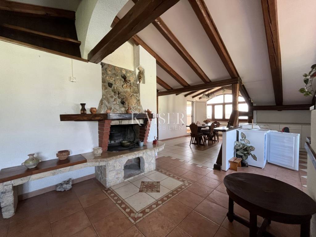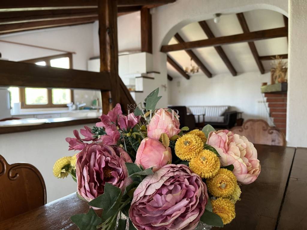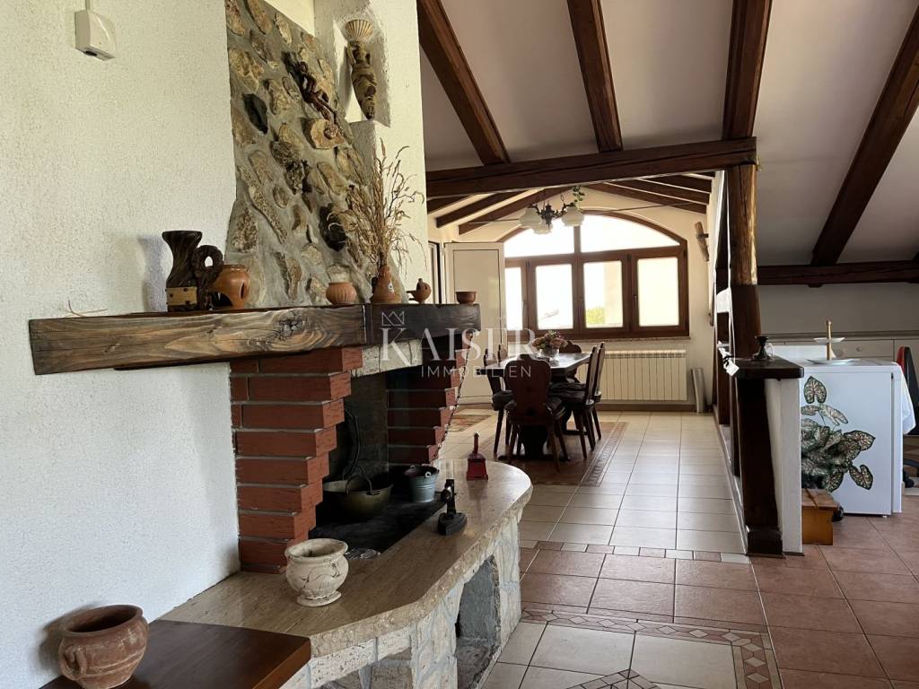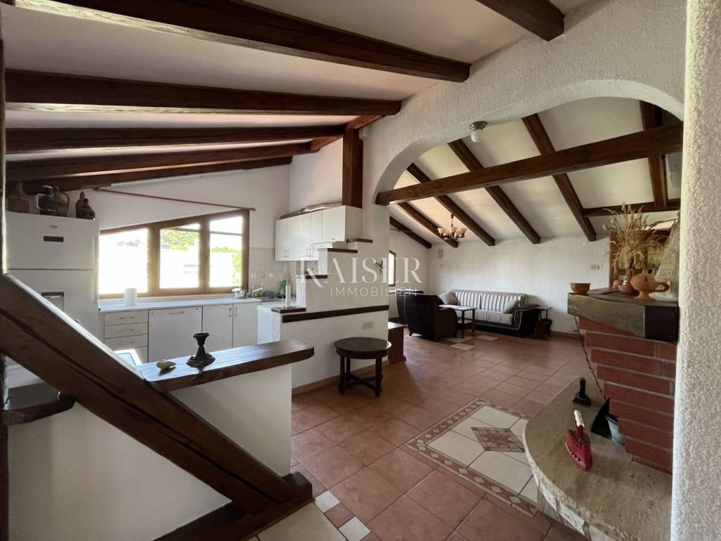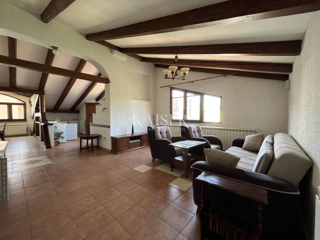 Sastoji se od ulaznog hodnika, velikog dnevnog boravka s kaminom, koji je povezan s kuhinjom, blagovaonicom i špajzom. Iz tog zajedničkog prostora izlazi se na zatvoreni krovni balkon s prekrasnim pogledom na more, koji se može koristiti tijekom cijele godine. U odvojenom spavaćem dijelu nalaze se dvije komforne spavaće sobe, svaka sa svojom kupaonicom, a jedna soba ima i prostrani walk-in ormar. Stan ima i dodatni odvojeni toalet. Prodaje se s kuhinjom, a grijanje je riješeno električnim radijatorima i s dvije novije klima jedinice koje služe i za hlađenje i za grijanje.