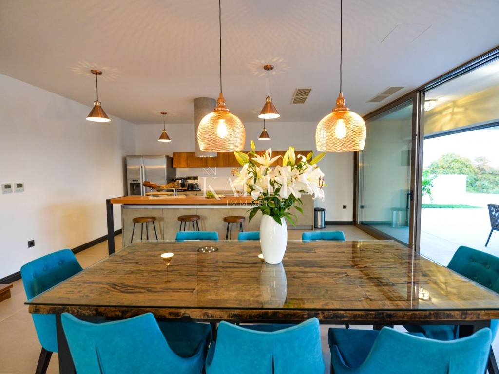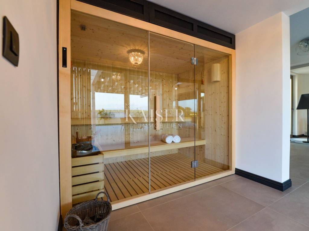 U prizemlju se nalaze prostrani dnevni boravak, moderna kuhinja s blagovaonicom, sauna, fitness zona i dodatna kupaonica, a sve je povezano s natkrivenom terasom i sunčalištem uz grijani bazen površine 32 m².