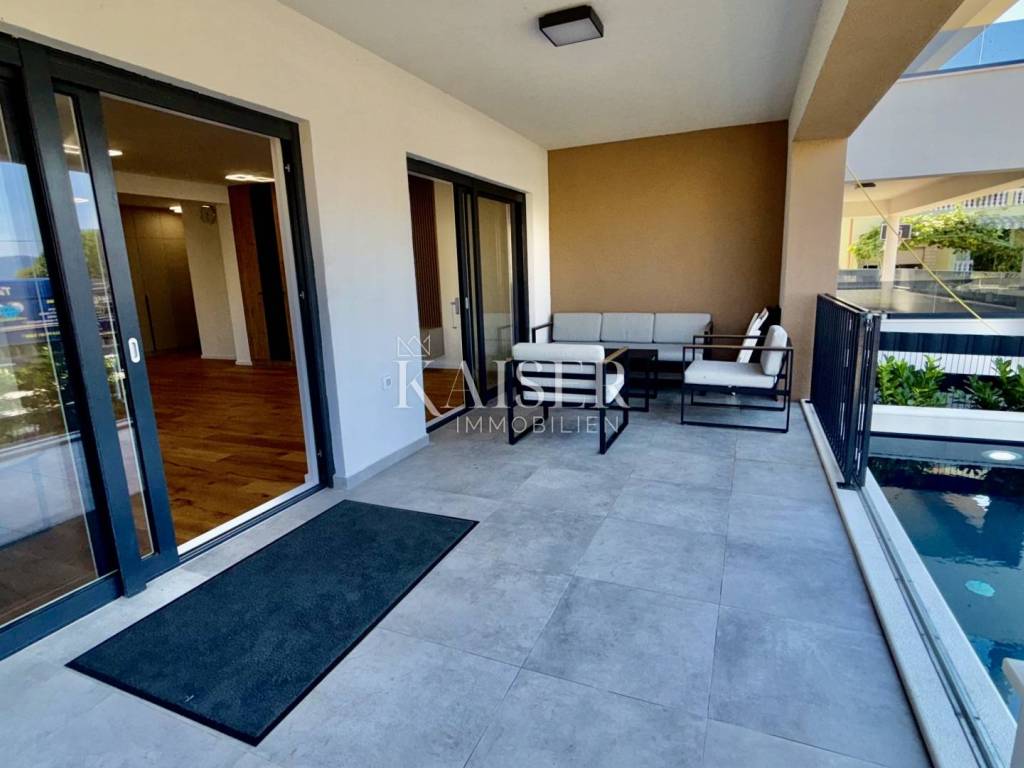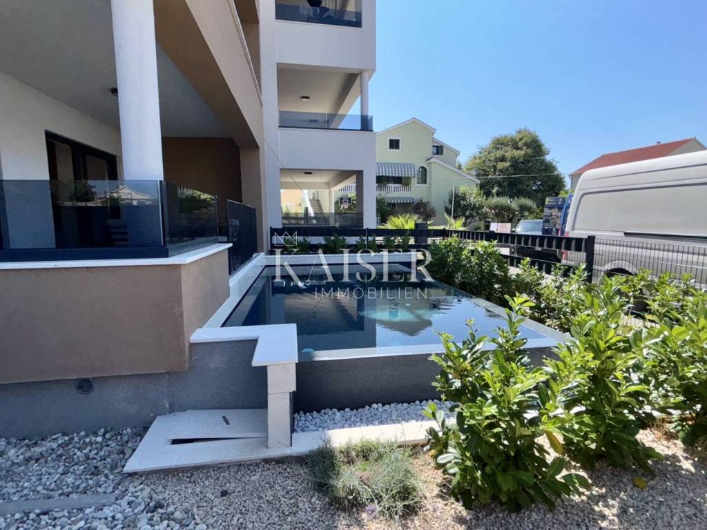 U maloj, luksuznoj stambenoj zgradi s ukupno šest jedinica, smještenoj na izuzetno mirnoj i poželjnoj lokaciji, svega 50 metara od kristalno čistog mora i uređene plaže, nalazi se ovaj vrhunski prizemni stan – savršen spoj suvremene arhitekture, privatnog vanjskog prostora i funkcionalnosti.