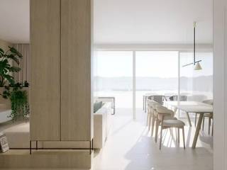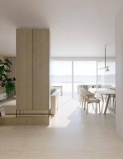 Prostor donje etaže otvara se impresivnim dnevnim boravkom s kuhinjom i blagovaonicom (57,7 m²), okupanima prirodnim svjetlom i izravno povezanim s natkrivenom terasom (20,3 m²) i balkonom (6,1 m²), odakle se pruža pogled na more. Ova središnja zona stana idealna je za opuštanje, druženje i uživanje u svakom trenutku dana.