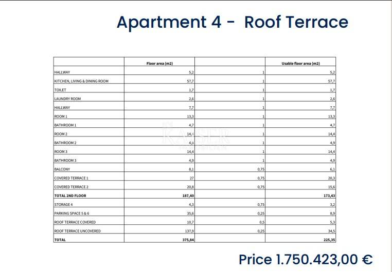 Ukupna bruto površina stana s pripadajućim prostorima iznosi 375,84 m², dok je neto korisna površina stana 225,35 m².