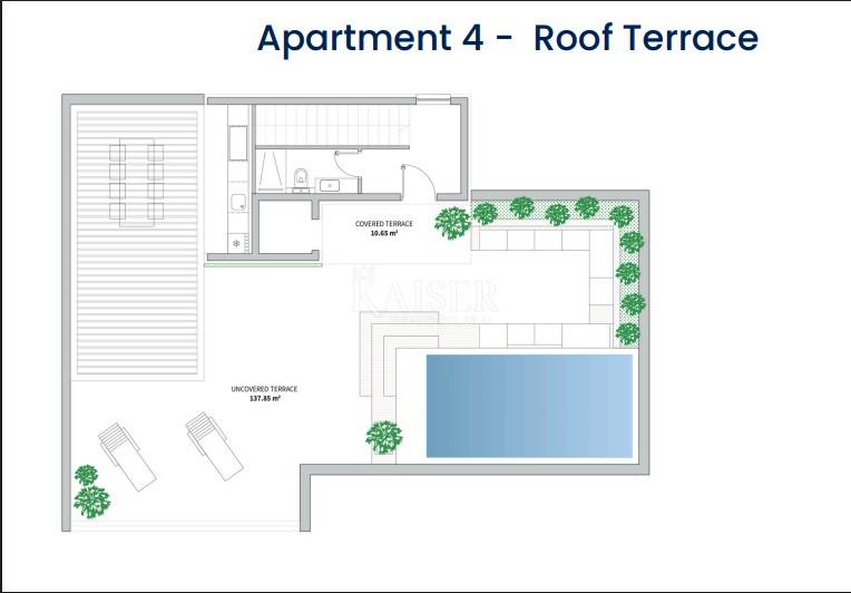 Direktan pristup dizalom iz stana vodi na ekskluzivnu krovnu terasu – vašu privatnu oazu mira i luksuza. Uz natkrivenu terasu (5,3 m²) za predah u hladu, prostire se impresivna otvorena terasa od čak 137,9 m², zamišljena kao multifunkcionalni prostor za uživanje na otvorenom: lounge zona s ležaljkama, sunčalište, prostor za objedovanje pod zvjezdanim nebom i zeleni kutak za opuštanje.