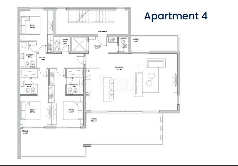 Tri prostrane spavaće sobe (13,3 m², 14,4 m² i 14,4 m²) svaka ima vlastitu elegantnu kupaonicu (4,7 m², 4,9 m², 4,9 m²), pružajući vrhunsku udobnost, mir i privatnost svakom članu obitelji ili gostu.