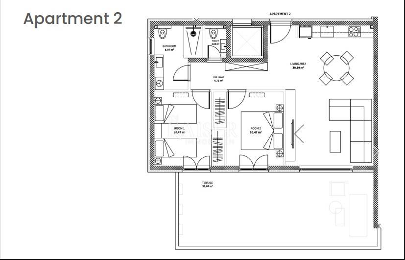 Stan uključuje dvije udobne spavaće sobe (svaka po 10 m2), moderno uređenu kupaonicu (5,97 m2) te dodatni toalet (1,55 m2), koji povećava funkcionalnost svakodnevice.