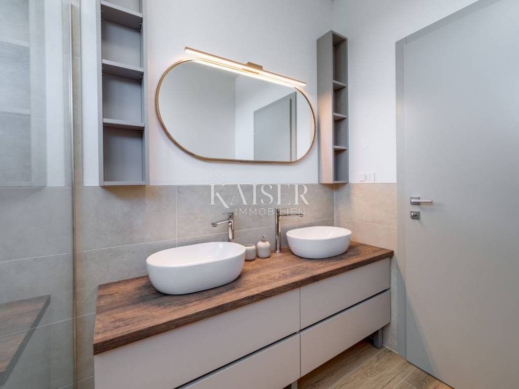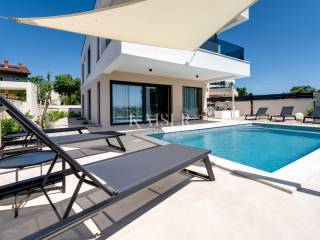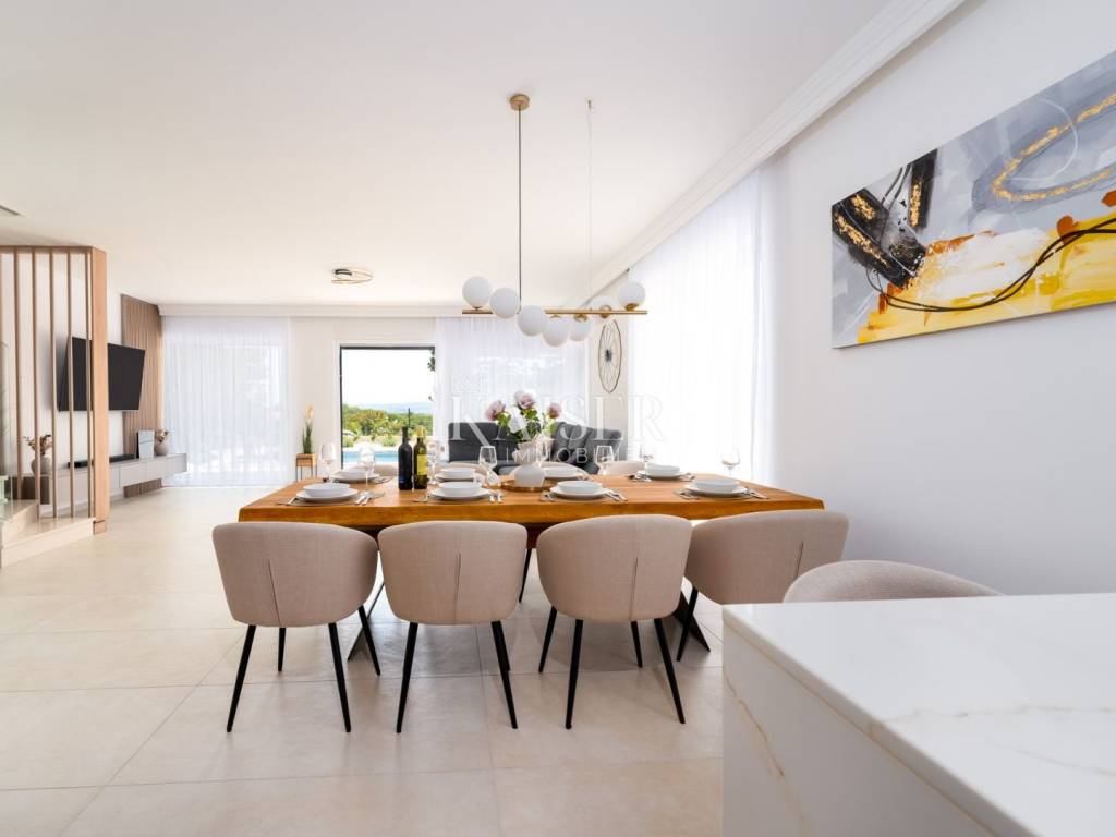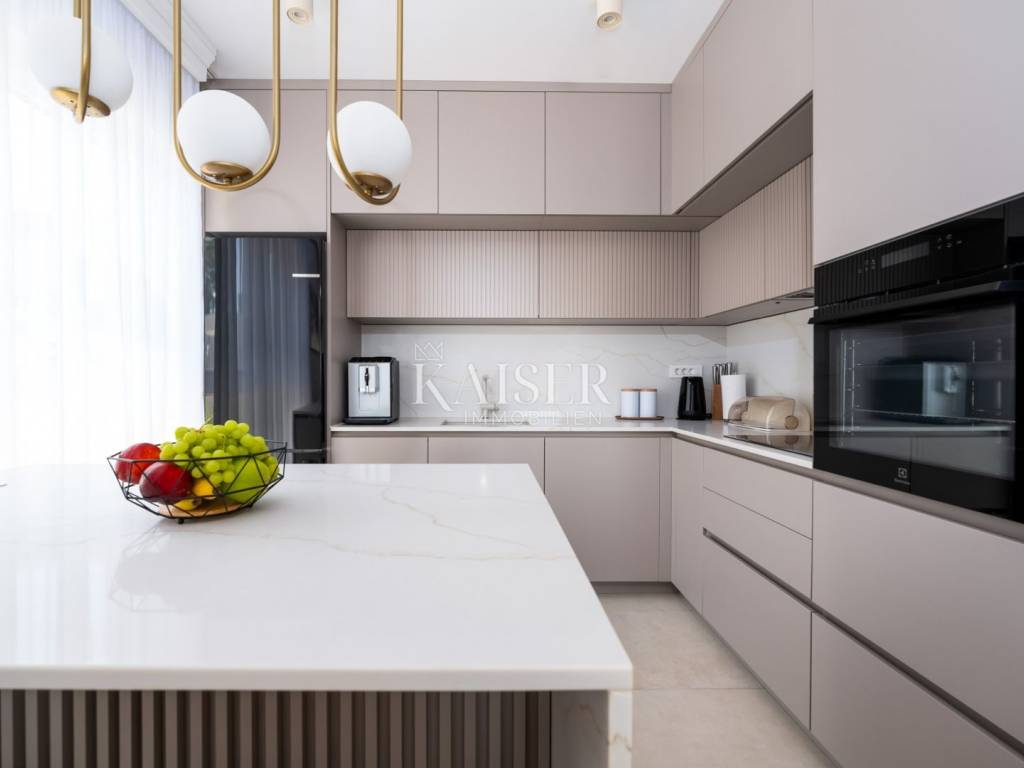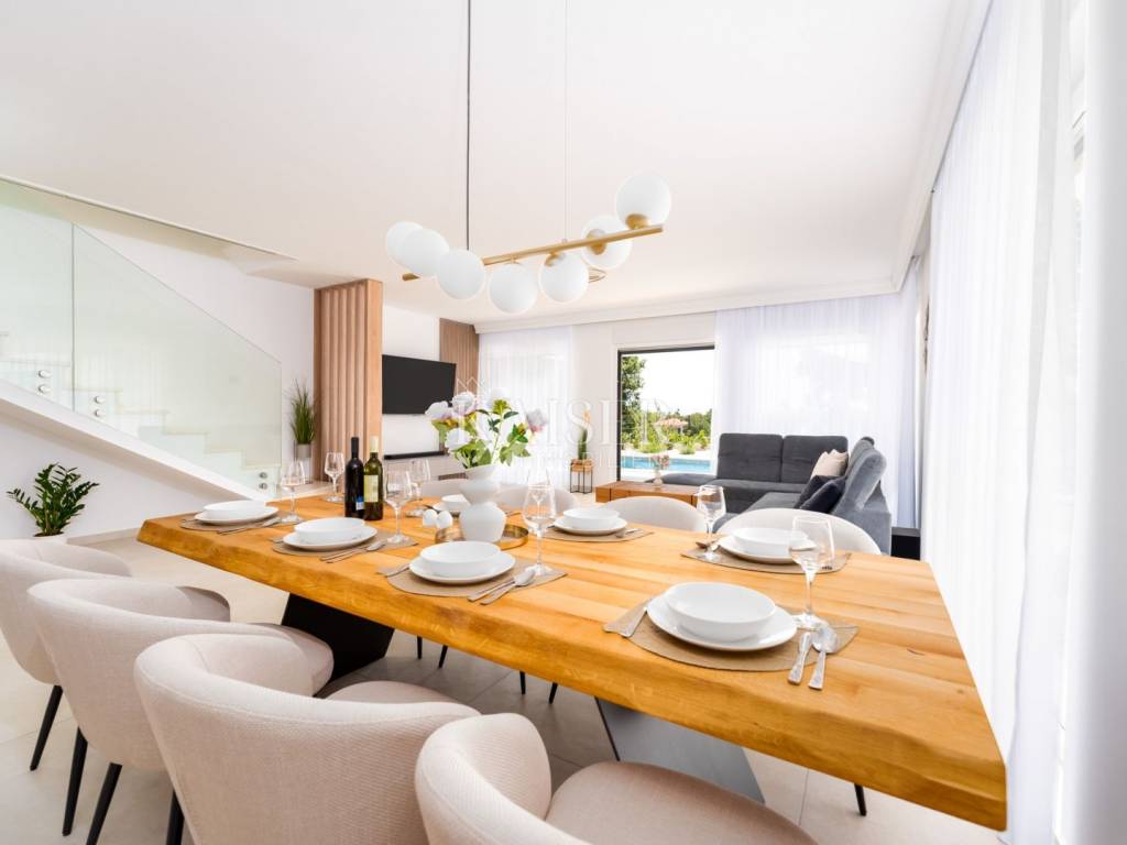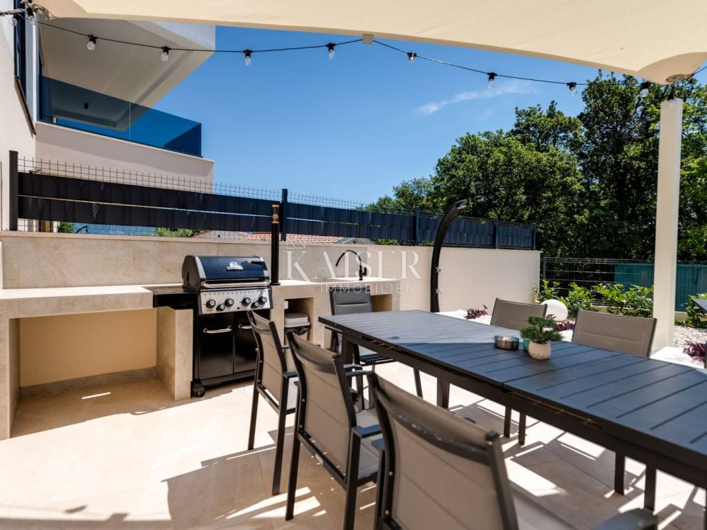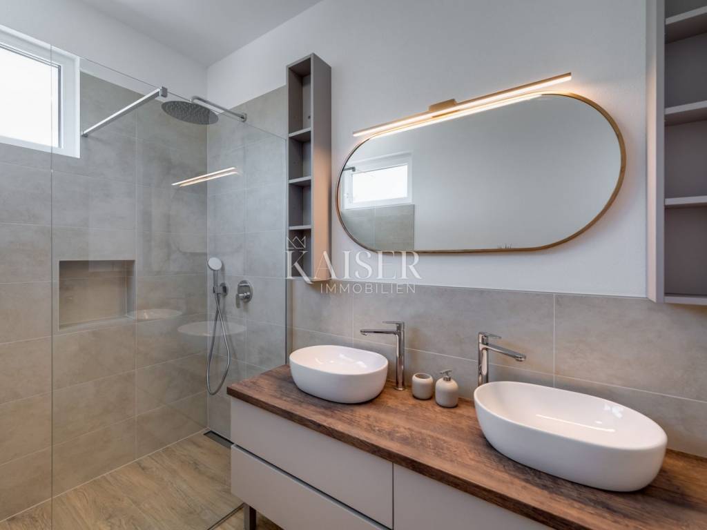 Koncept ove moderne dvojne ville prostire se na dvije etaže ukupne površine 195 m2. U prizemlju se nalazi prostrani dnevni prostor koji se sastoji od boravka, kuhinje i blagovaonice, te kupaonica, prostor za druženje i vešeraj. Na katu su smještene četiri spavaće sobe i tri kupaonice. Dvije sobe imaju izlaz na prostrane natkrivene balkone sa kojih pogled seže na umirujuće zelenilo obližnje šume, obzirom da se objekt nalazi na granici sa zelenim pojasom, a ujedno 500 m od mora.