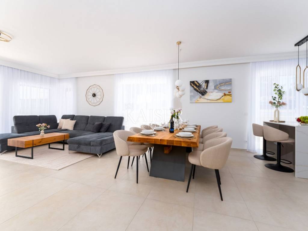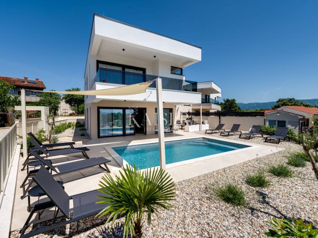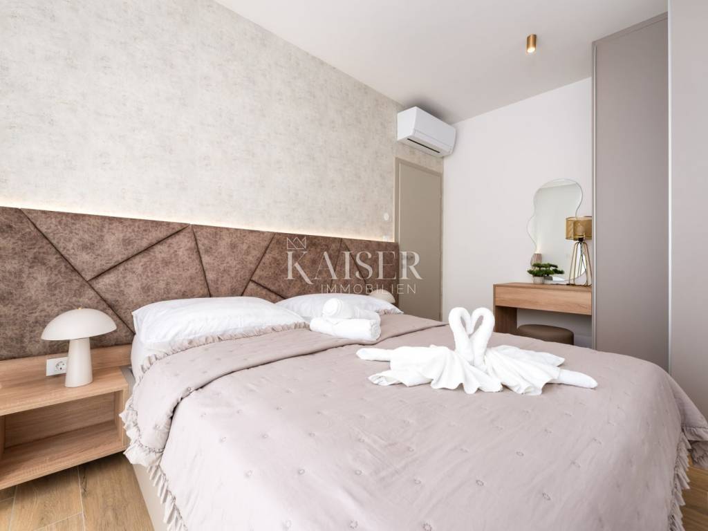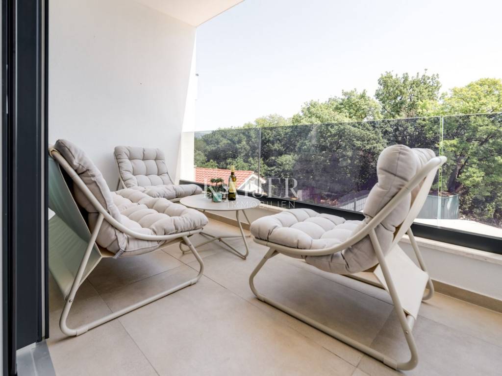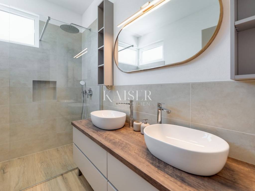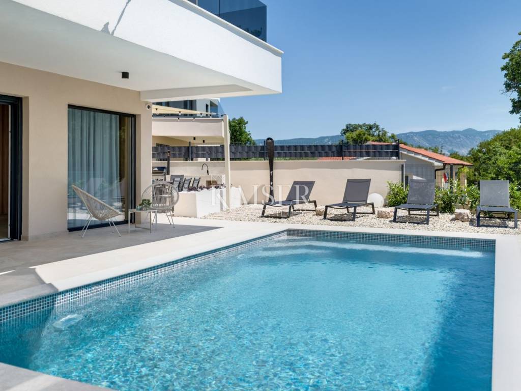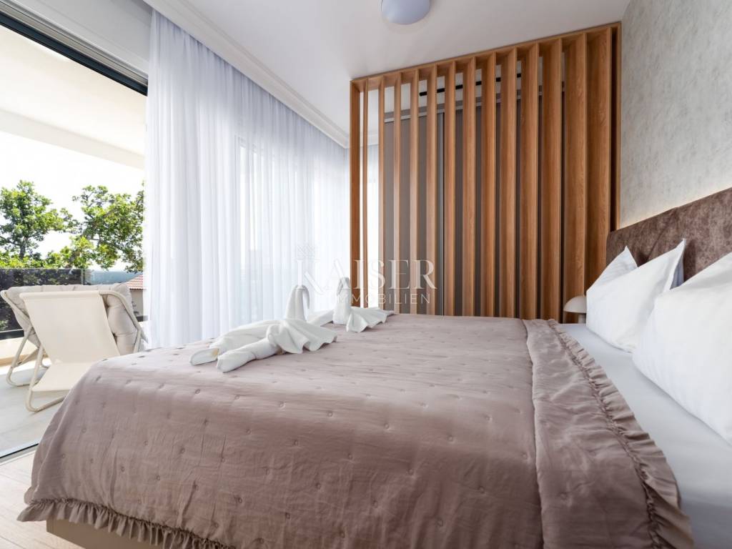 Koncept ove moderne dvojne ville prostire se na dvije etaže ukupne površine 195 m2. U prizemlju se nalazi prostrani dnevni prostor koji se sastoji od boravka, kuhinje i blagovaonice, te kupaonica, prostor za druženje i vešeraj. Na katu su smještene četiri spavaće sobe i tri kupaonice. Dvije sobe imaju izlaz na prostrane natkrivene balkone sa kojih pogled seže na umirujuće zelenilo obližnje šume, obzirom da se objekt nalazi na granici sa zelenim pojasom, a ujedno 500 m od mora.