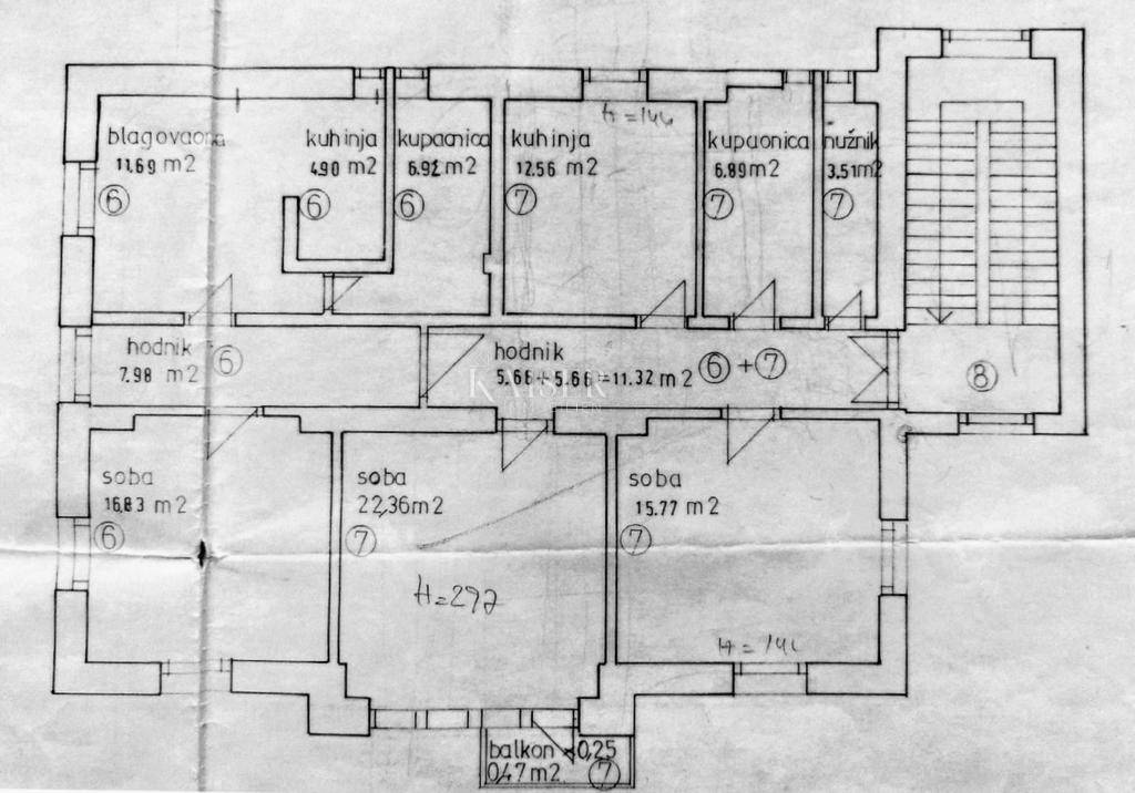 Stan ima ukupnu površinu od 140 m2, ali pošto se nalazi u visokom potkrovlju, nakon primjene odgovarajućeg koeficijenta dobijemo podatak 121,2 m2 (kvadrature prikazane u priloženom tlocrtu su već nakon primjene odgovarajućih koeficijenata).