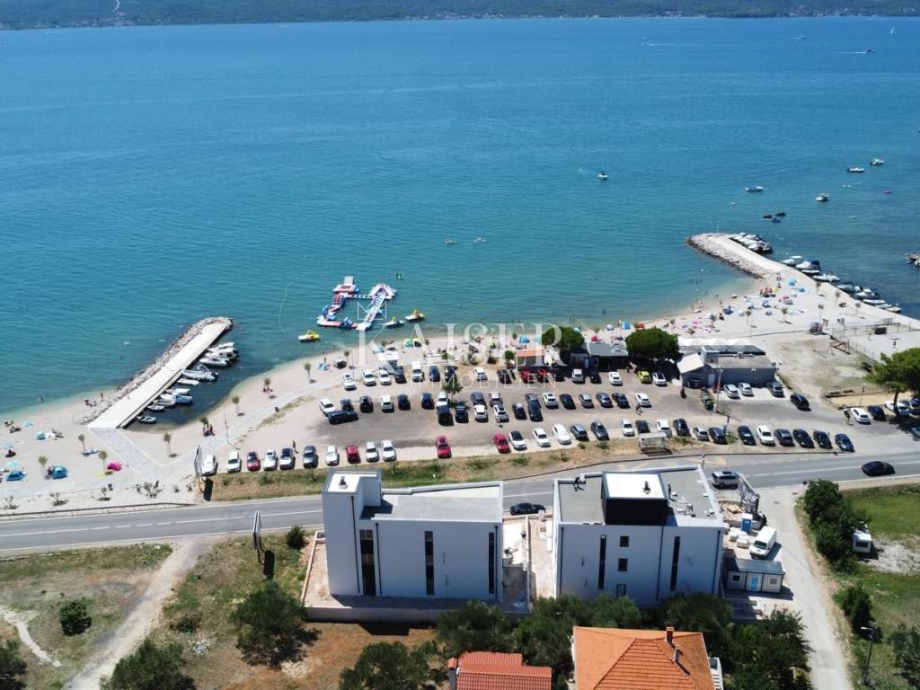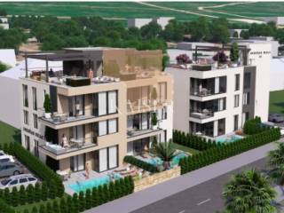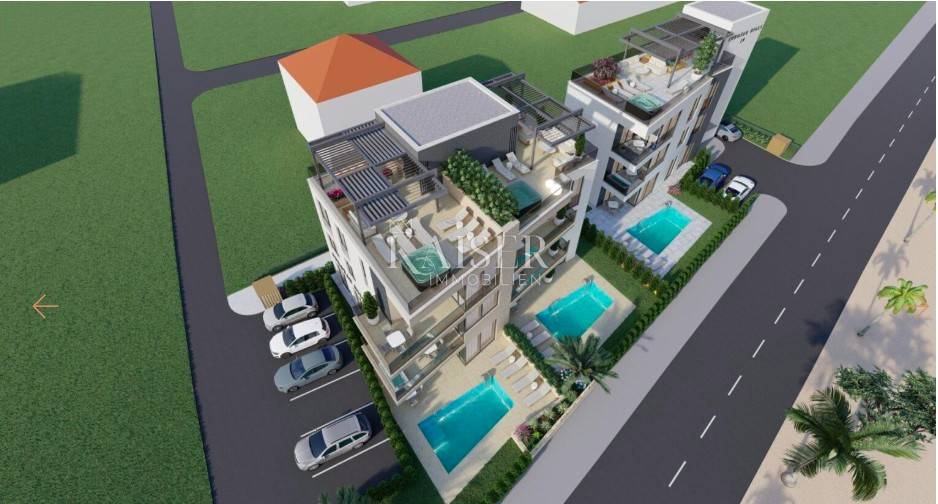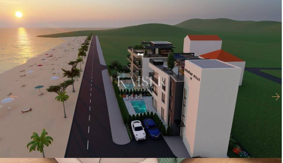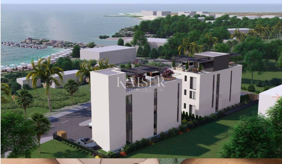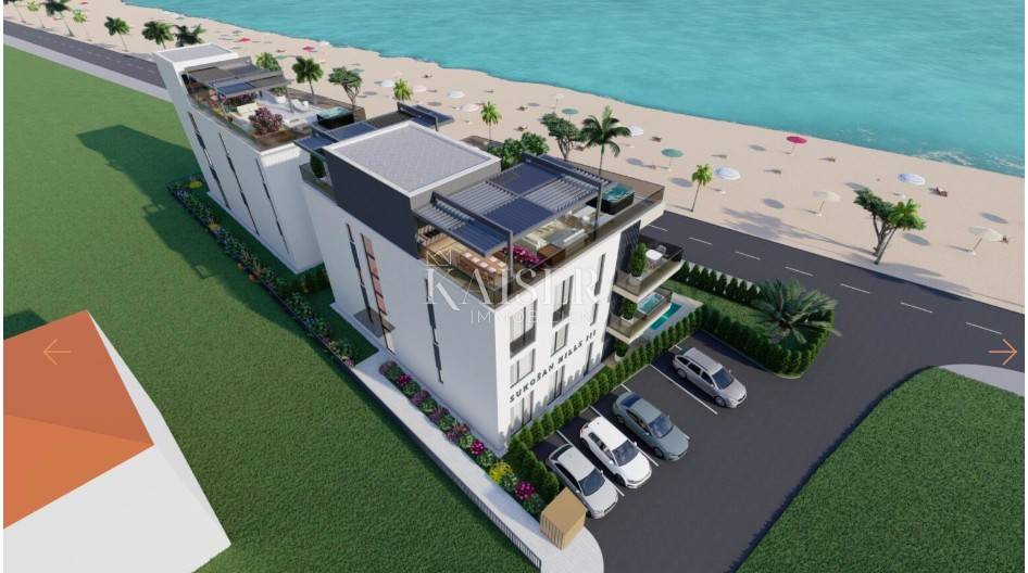 Samo nekoliko koraka od kristalno čistog mora smješten je luksuzni kompleks koji nudi ekskluzivnu priliku za život na Jadranskoj obali. Unutar ovog modernog kompleksa s ukupno šest stambenih jedinica, na posljednjem katu zgrade, nalazi se ekskluzivan stan S06 s prostranom krovnom terasom koja pruža spektakularan pogled na more i okolicu.