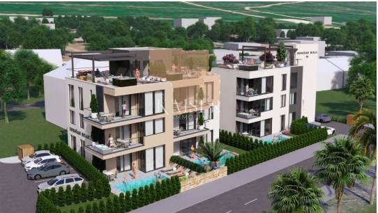 Zgrada je dizajnirana s naglaskom na eleganciju, privatnost i udobnost, a stanari imaju na raspolaganju niz premium sadržaja, uključujući privatne bazene u prizemnim stanovima i prostrane krovne terase s panoramskim pogledom. U sklopu stambenog kompleksa, svaki stan dolazi s vlastitim parkirnim mjestom koje je uključeno u kupnju stana. Osim toga, postoji mogućnost dodatne kupnje mjesta u podzemnoj garaži, koja pruža dodatnu sigurnost i praktičnost vlasnicima stanova.