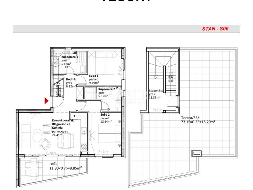 • Stepenište (11,39 m²) vodi do ekskluzivne krovne terase (73,15 m²) s prodajnom površinom od 18,29 m².