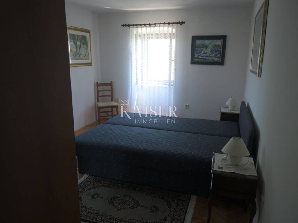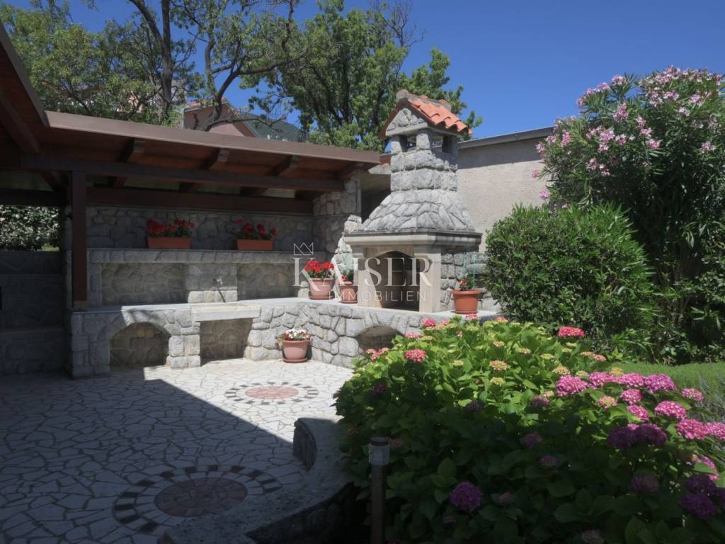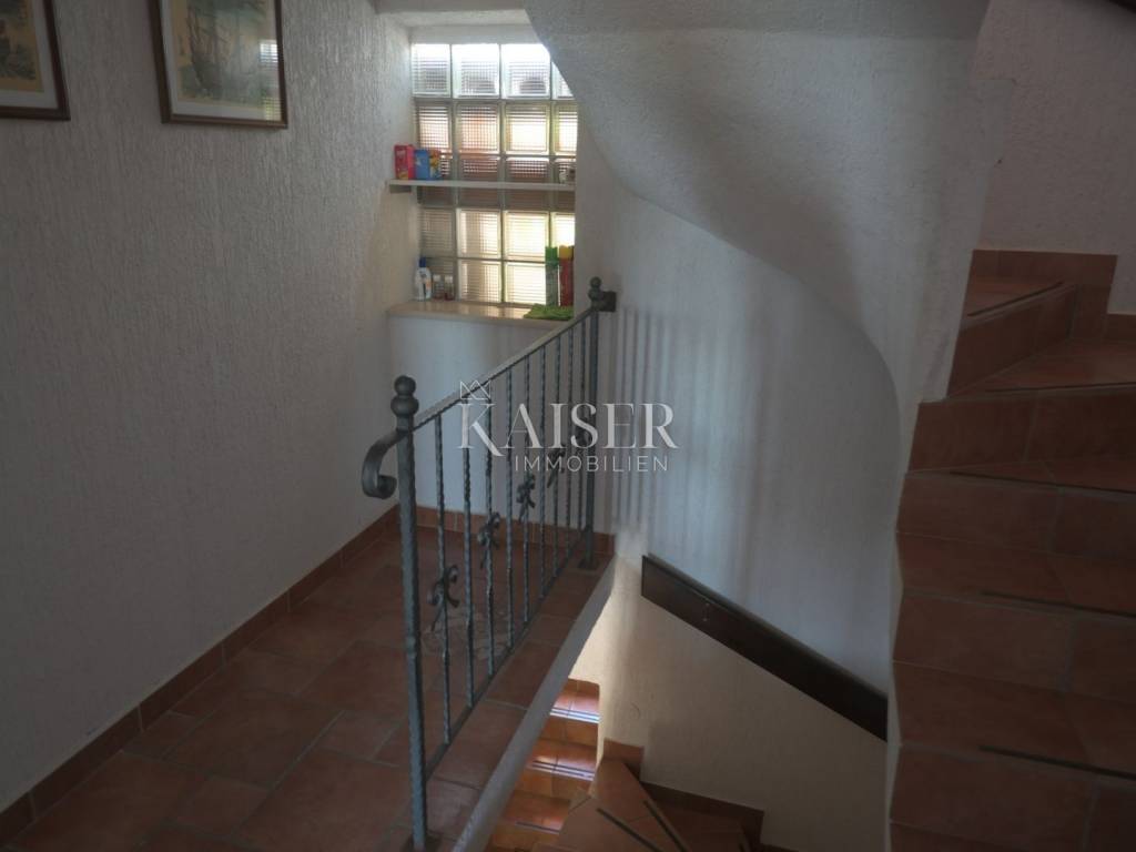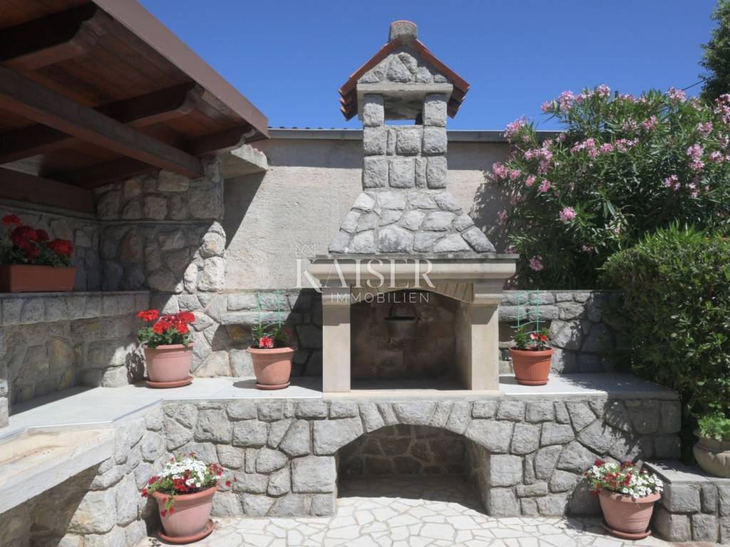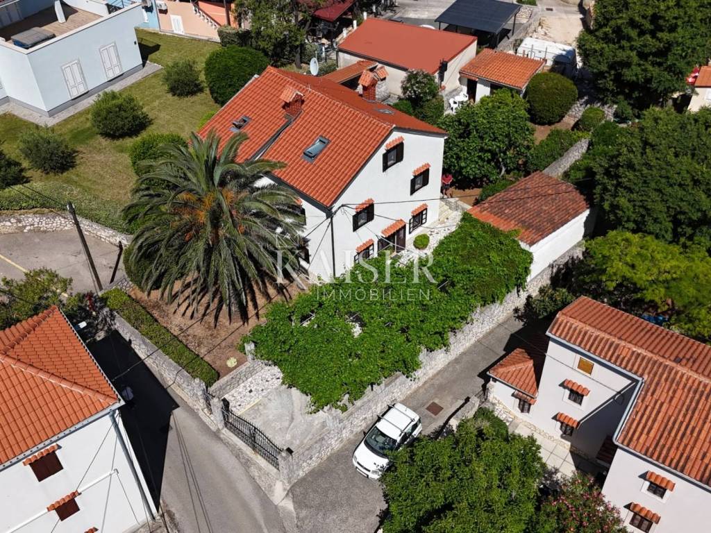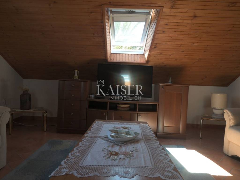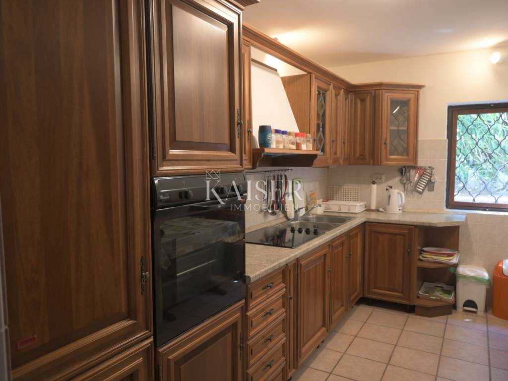 Ova kompletno opremljena luksuzna nekretnina sastoji se od prizemlja u kojem je smještena kuhinja, veliki dnevni boravak s kaminom i kupaonica s WC-om. Na prvom katu nalazi se prostrani hodnik, tri spavaće sobe i dvije kupaonice. U potkrovlju se nalaze dvije spavaće sobe. S prvog kata i iz potkrovlja pruža se prekrasan pogled na more. Uz kuću se nalazi prostrana terasa od 80 m², roštilj, lijepo uređeni vrt, privatno parkiralište za više vozila s garažom od 25 m² te konoba od 13 m² i vanjski tuš. Ukupna površina nekretnine je vrlo lijepo raspoređenih 533 m², uz zajamčenu privatnost.