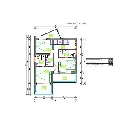 - Na katu: hodnik, tri spavaće sobe, tri kupaonice, natkrivena terasa, ukupno 87m2