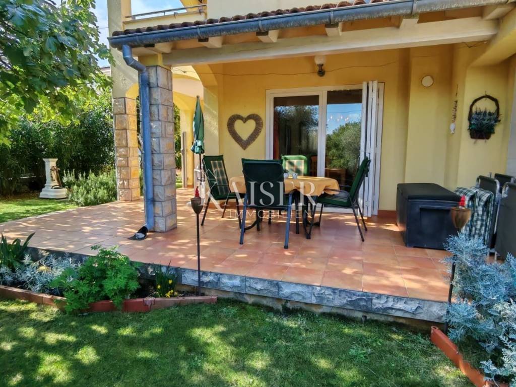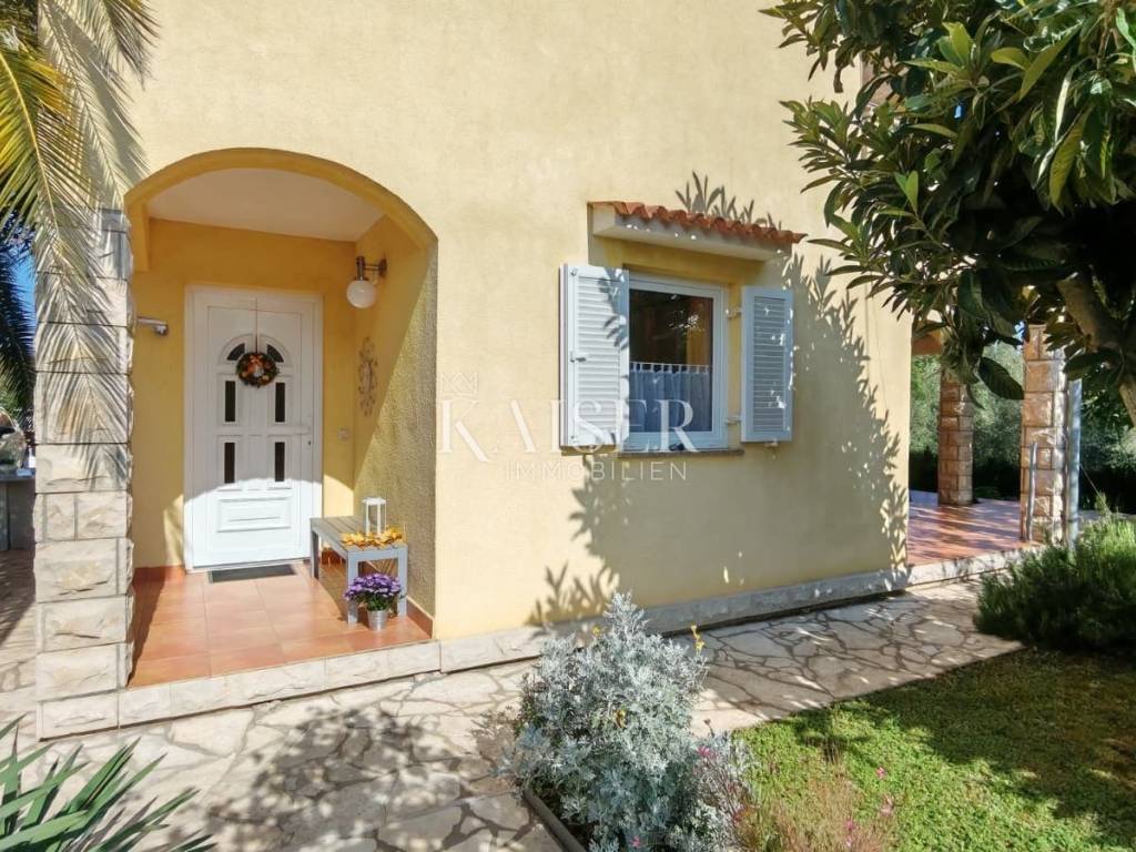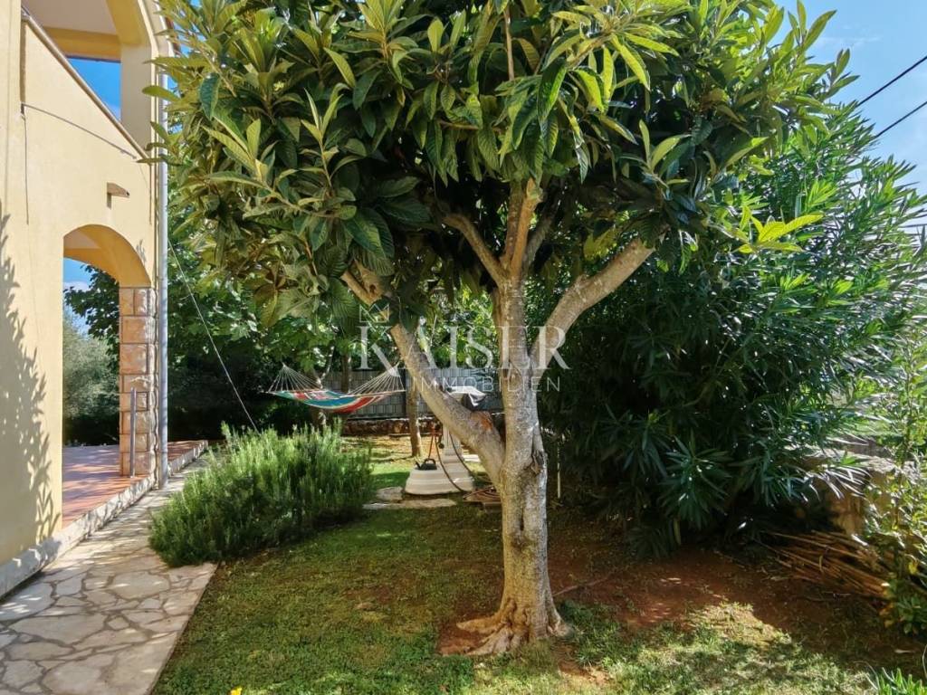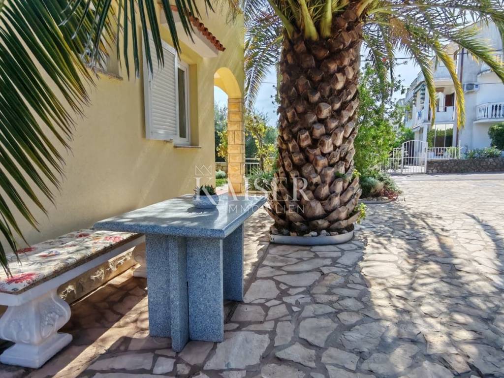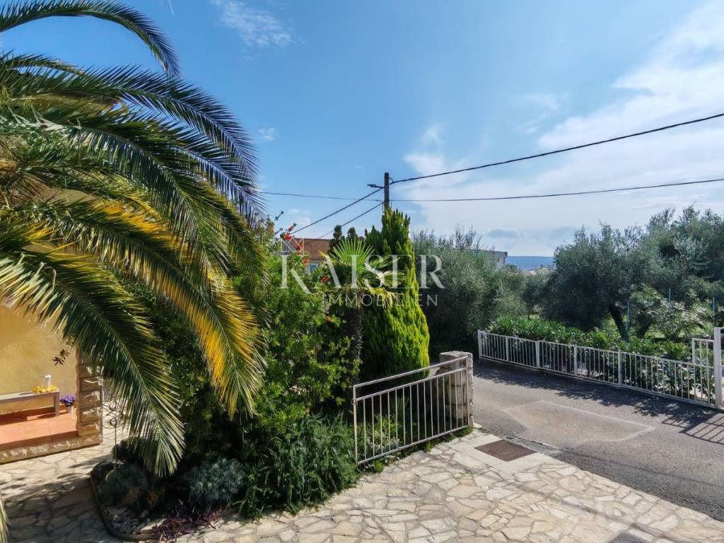 Posebnu vrijednost ovoj nekretnini daje uređena okućnica površine 150 m², bogata mediteranskim biljem i zelenilom. U dvorištu se nalaze kanarska datulja stara 19 godina, dvije vrste smokava, oleander, mlada palma, četkovac i ruzmarin, koji daju sjenu, mirise i vizualni ugođaj Mediterana. Na raspolaganju je i metalna kućica od gotovo 4 m², pogodna za odlaganje alata ili drva, dok kući pripada i jedno parkirno mjesto.