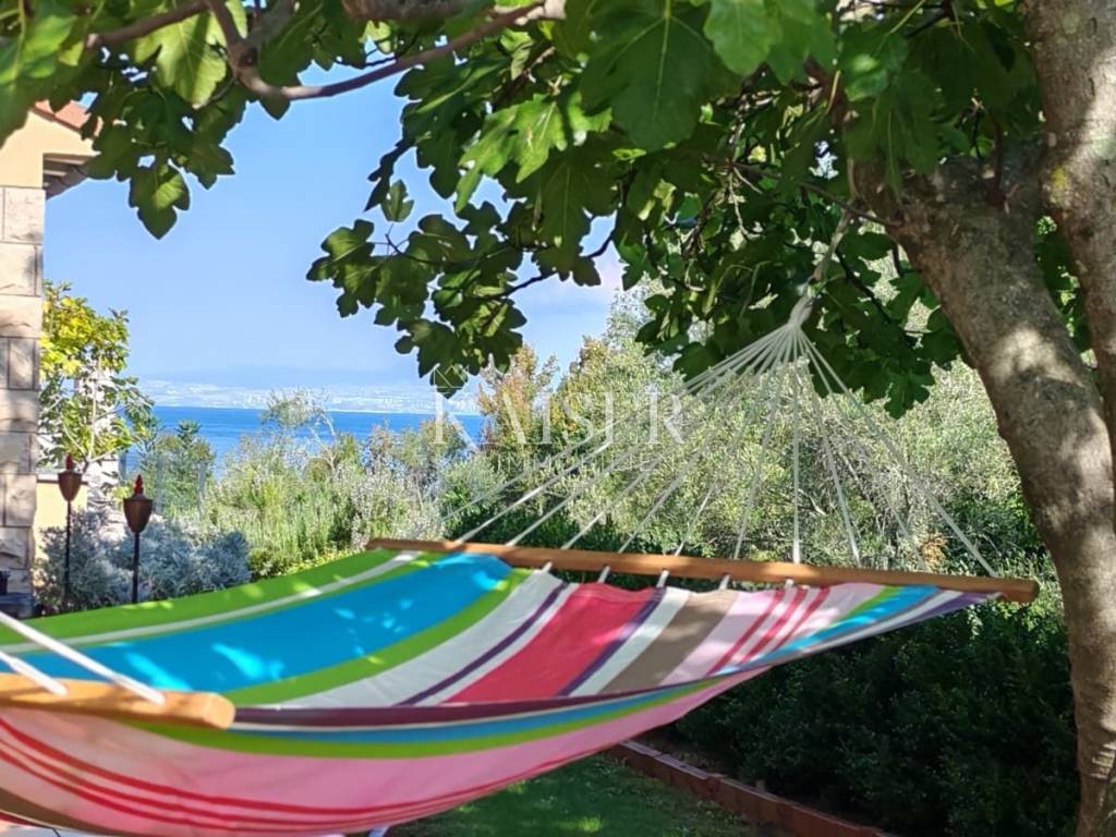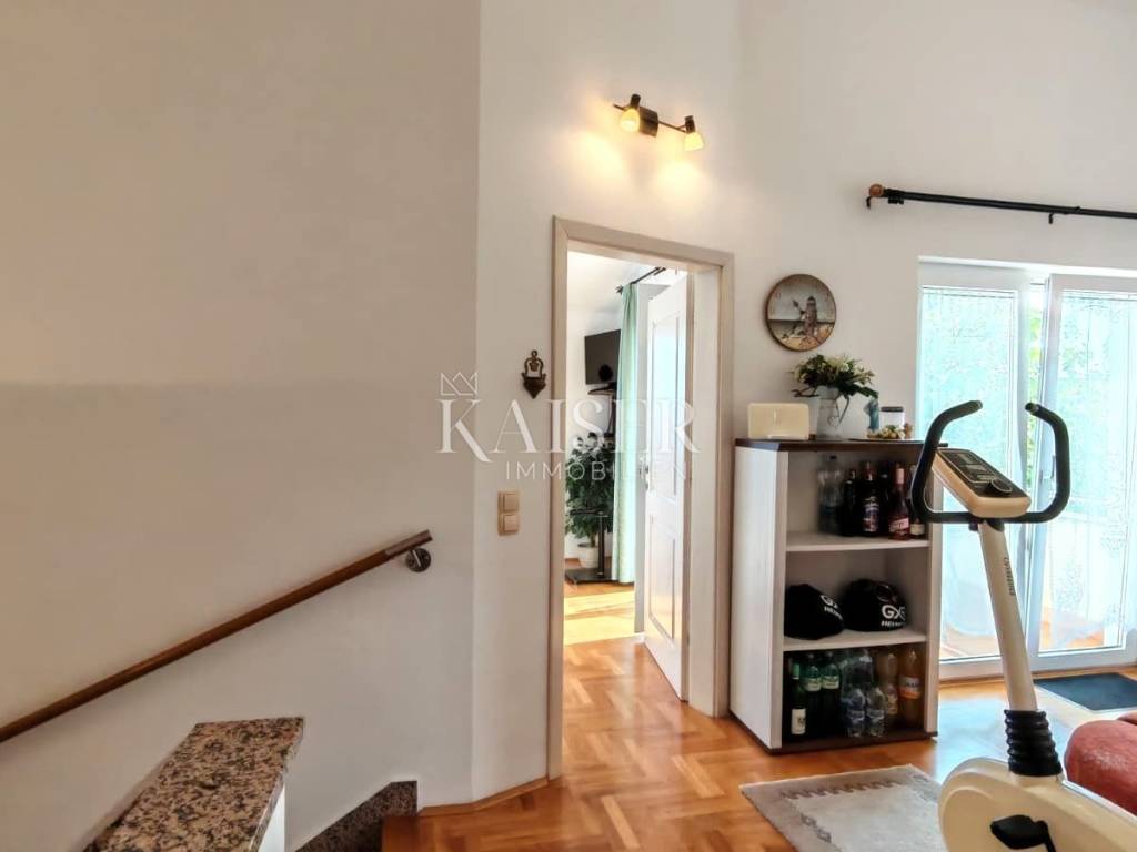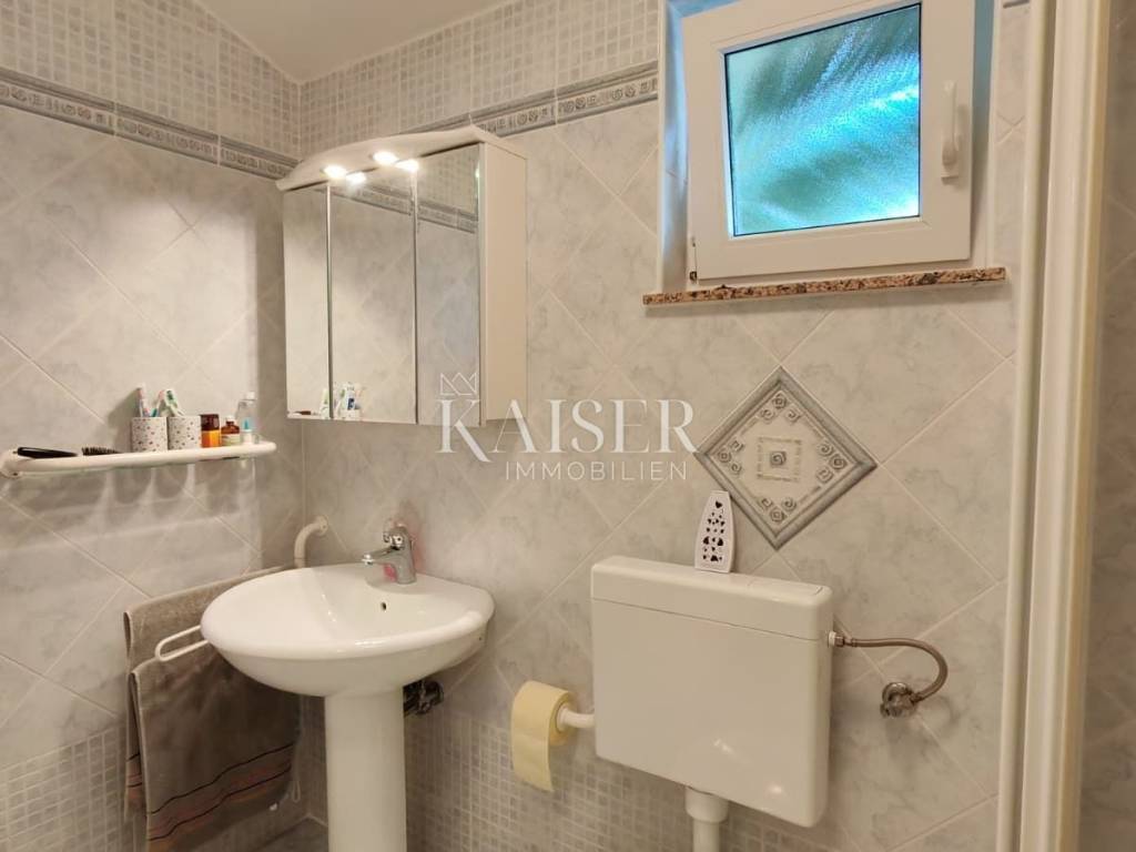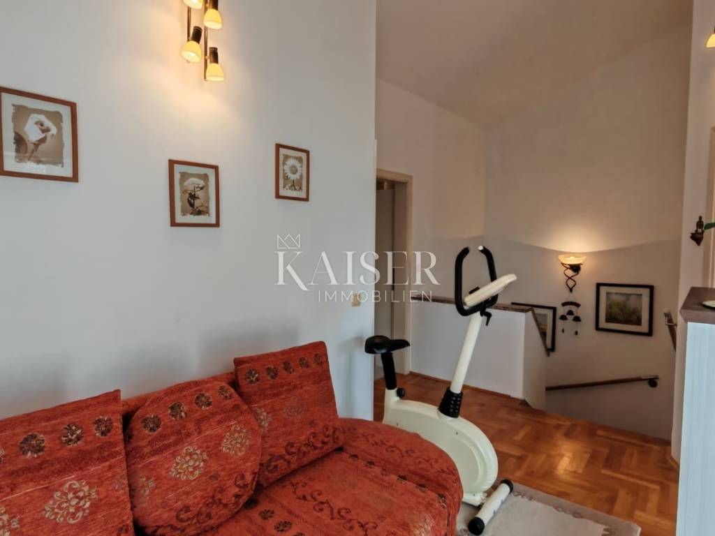 Na katu, hodnik od 3,25 m² povezuje tri prostorije i kupaonicu. Kupaonica od 4,28 m² opremljena je tušem, WC-om i bideom te zahvaljujući prozoru ima prirodnu ventilaciju i svjetlost. Manja spavaća soba od 7,23 m² trenutno se koristi kao garderoba, dok otvoreni prostor od 5,99 m² sa sofom na razvlačenje ima izlaz na terasu. Glavna spavaća soba od 11,09 m² pruža očaravajući pogled na more i izravni izlaz na terasu površine 7,15 m², s koje se pruža pogled na more i okolnu prirodu.