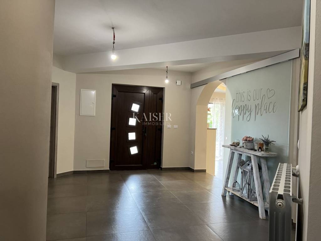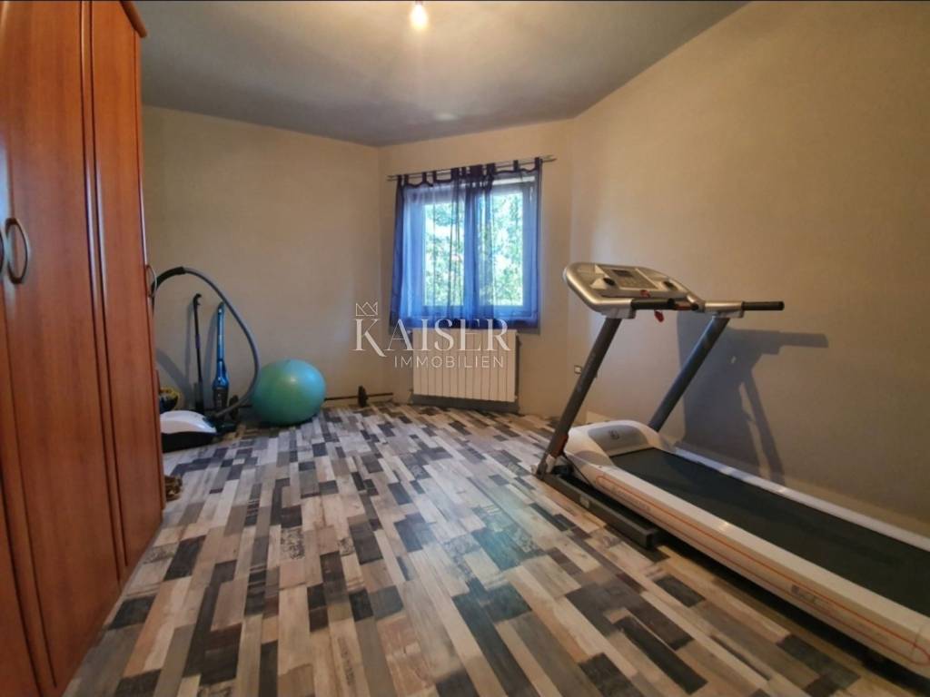 U prizemlju imamo spavaću sobu, kupaonica, ostavu, veliki dnevni boravak, blagovaonicu i kuhinju te izlaz u garažu u kojoj se nalazi i kotlovnica za centralno grijanje na drva. Na katu se nalaze tri spavaće sobe od kojih svaka ima izlaz na veliku terasu s koje se pruža pogled na okolinu i Kastav, te velika kupaonica.