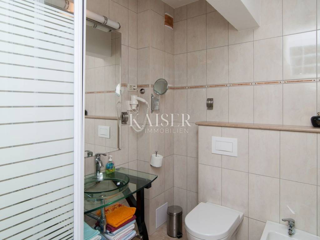 Ovaj objekt ukupne stambene površine 300m2 razveden je na tri etaže. U prizemlju se nalazi prostrani dnevni prostor povezan sa vanjskom terasom što sve zajedno čini skladno mjesto za boravak i opuštanje. Dnevni prostor sastoji se od kuhinje, blagovaonice i boravka, a tu je i gostinjski toalet i ostava. Na prvom katu nalaze se dvije spavaće sobe, svaka sa svojim izlazom na balkone sa kojih se pruža prekrasan pogled na more i zelenilo otoka Brača, a tu je još i kupaonica i sauna. Na drugom katu - potkrovlju, nalaze se dodatne dvije spavaće sobe sa vlastitim en-suite kupaonicama, od kojih jedna ima izlaz na balkon.