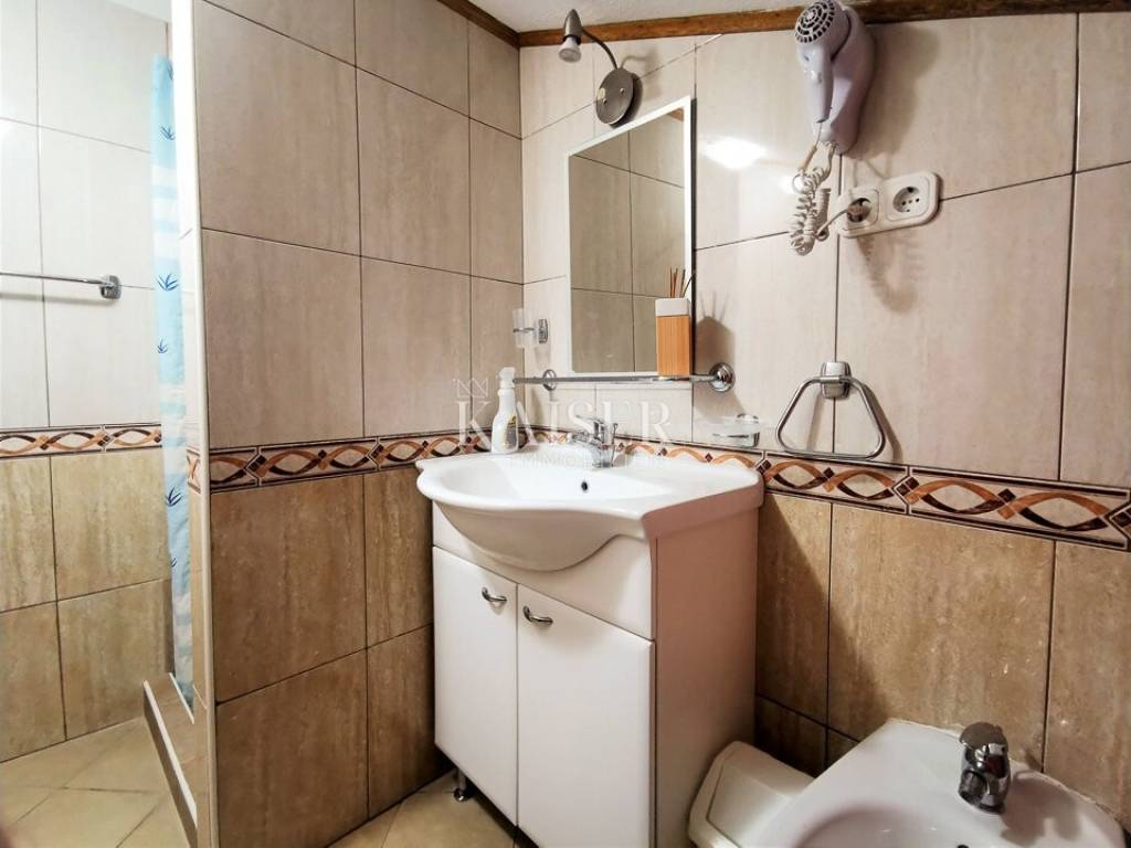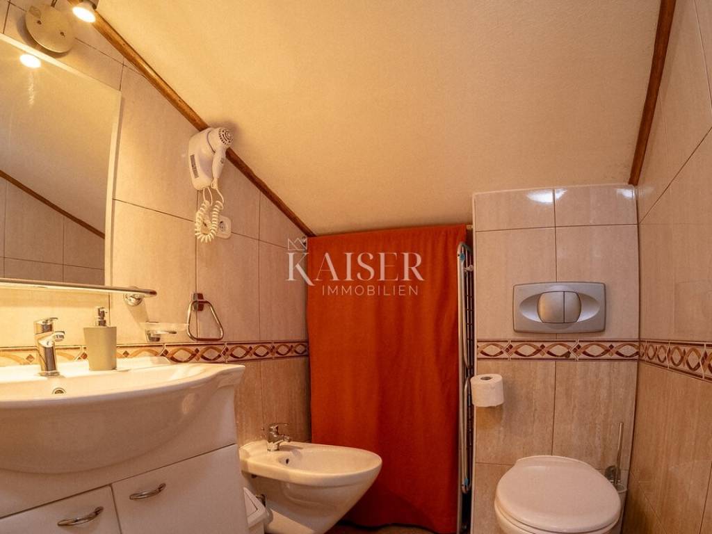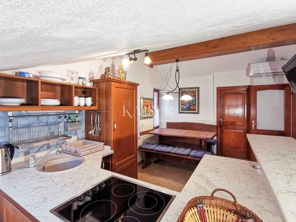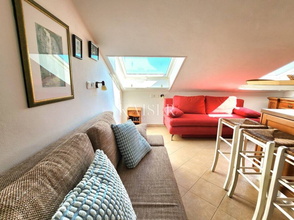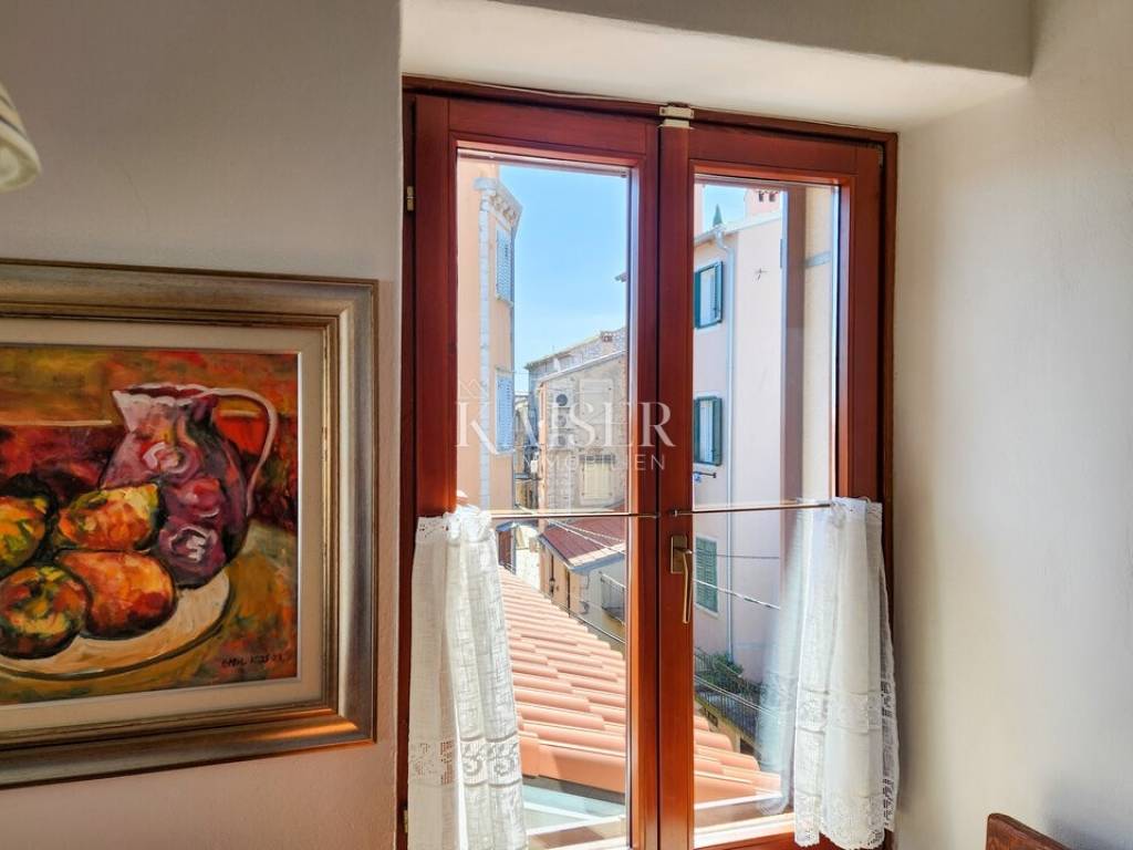 Kaiser Immobilien vam predstavlja prostran stan od 63 m², smješten na drugom katu autentične kamene zgrade u staroj jezgri Rovinja, na jednoj od najrjeđih i najpoželjnijih lokacija – u prvom redu do mora. Dugi ulazni hodnik vodi vas prema svijetlom središnjem dijelu stana, prostoru koji zahvaljujući velikim krovnim prozorima odiše toplinom i posebnom atmosferom. U jednoj prostranoj cjelini smješteni su dnevni boravak, blagovaonica i potpuno opremljena kuhinja s električnim štednjakom, Zanussi pećnicom i novim Beko hladnjakom, a pogled na more koji dopire kroz krovne otvore čini ovaj prostor iznimno ugodnim i jedinstvenim.