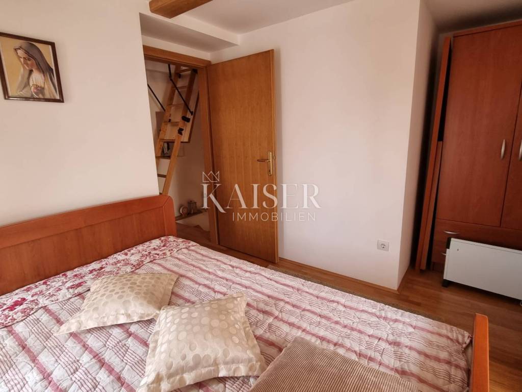 U potkrovlje se ide stepenicama na izvlačenje, te se u potkrovlju nalazi velika prostrana spavaća soba od 19,5 m2 gdje se nalaze dva kreveta. Iz potkrovlja se kroz prozor proteže predivan pogled na more i Omišalj.