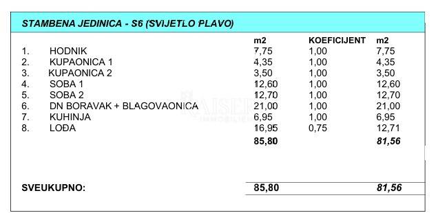Stan, oznake S6, nalazi se na trećem katu zgrade koja je trenutno u izgradnji, s planiranim dovršetkom i ishođenjem uporabne dozvole do 1. lipnja 2026. godine. Ukupna neto prodajna površina stana iznosi 81,56 m², a nudi odličan raspored prostorija i prostranu lođu.