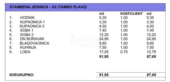 Stan, oznake S3, nalazi se na prvom katu zgrade koja je trenutno u izgradnji, s planiranim dovršetkom i ishođenjem uporabne dozvole do 1. lipnja 2026. godine. Ukupna neto prodajna površina stana iznosi 87,69 m², a nudi odličan raspored prostorija i prostranu lođu.