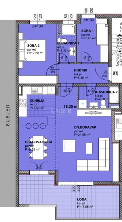 Lođa: 17,05 m² (neto korisna površina 12,79 m²) – Prostrana natkrivena terasa idealna za uživanje na otvorenom.