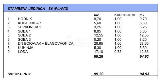 Stan, oznake S6, nalazi se na trećem katu zgrade koja je trenutno u izgradnji, s planiranim dovršetkom i ishođenjem uporabne dozvole do 1. lipnja 2026. godine. Ukupna neto prodajna površina stana iznosi 94,93 m², a nudi odličan raspored prostorija i prostranu lođu.