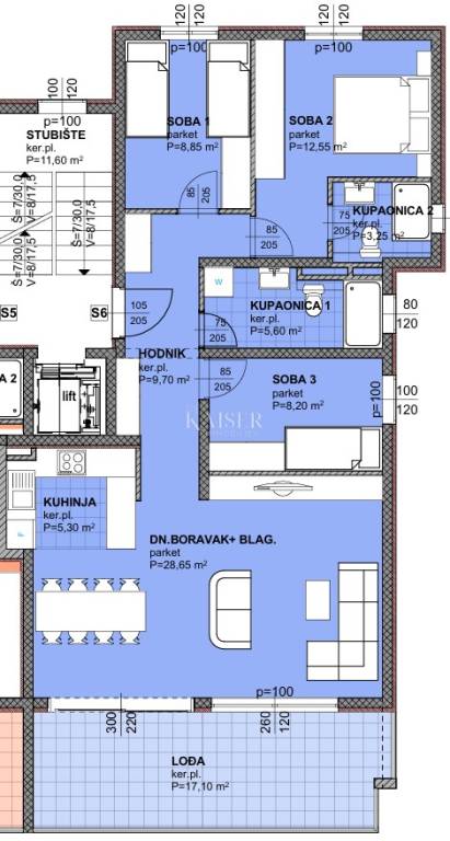Lođa: 17,10 m² (neto korisna površina 12,83 m²) – Prostrana natkrivena terasa idealna za uživanje na otvorenom.