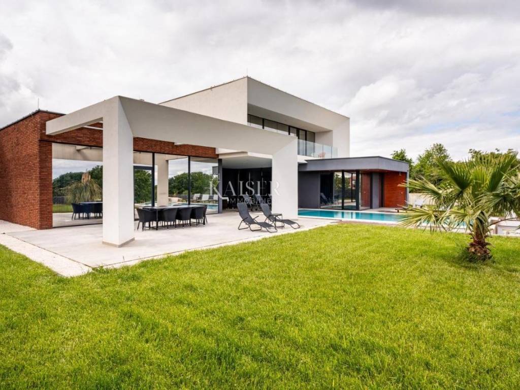 Prostrana okućnica u potpunosti je uređena te ograđena. Pruža parking za više automobila, uređeni travnjak, sunčalište te grijani bazen ukupne površine 40 m2. Bazen je grijani inverterskom dizalicom topline od 15 kW + solarnim panelima na krovu zgrade. Također ima najsuvremeniju dezinfekciju vode putem soli, elektrolizom stvara prirodni klor. Sunčalište bazena također pruža i roštilj te pregršt prostora za druženje i odmor.